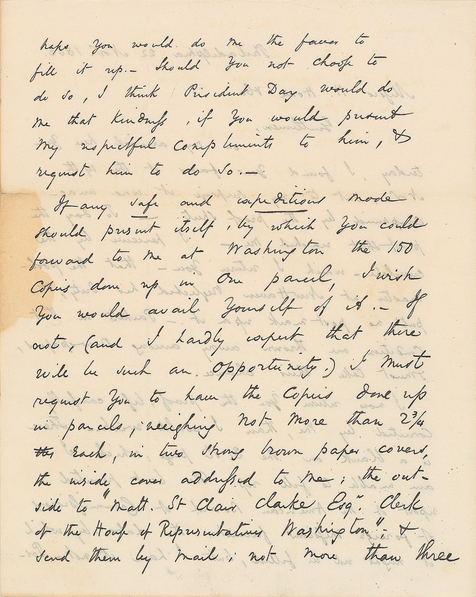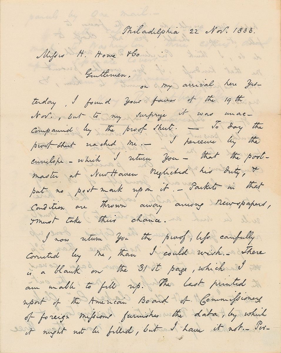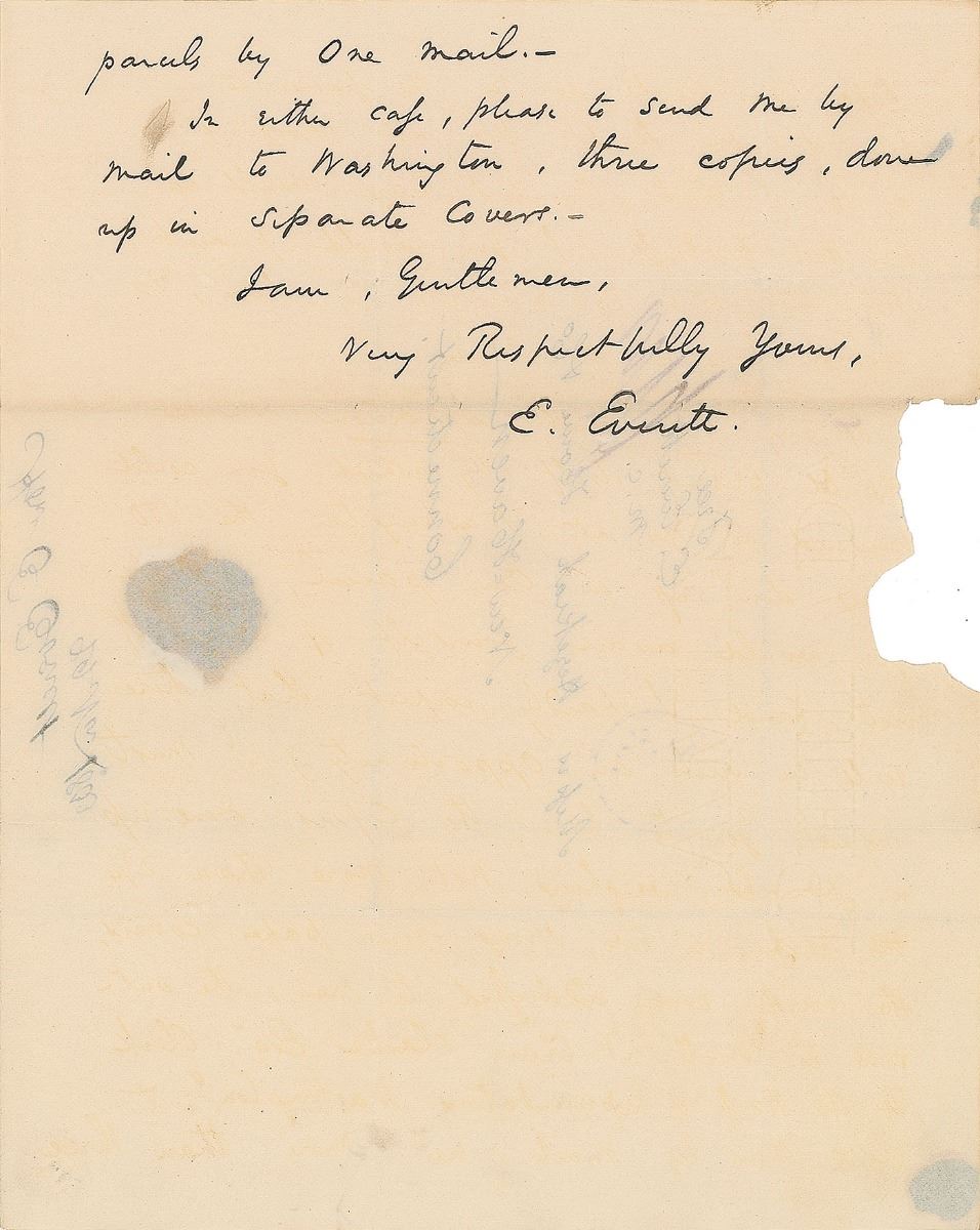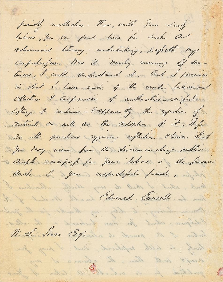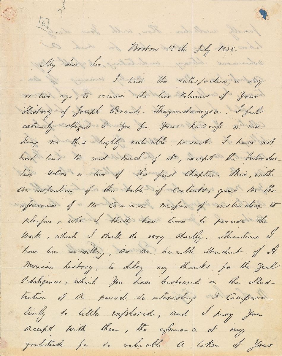 Two ALSs, signed “E. Everett” and “Edward Everett,” five total pages, both 7.75 x 9.75. The first, dated November 22, 1833, in part: “I now return you the proof, less carefully corrected by me, than I could wish. There is a blank on the 31st page, which I am unable to fill up. The last printed report of the American Board of Commissioners of foreign missions furnishes the data, by which it might not be filled, but I have it not. Perhaps you would do me the favor to fill it up. Should you not choose to do so, I think President Day would do me that kindness, if you would present my respectful compliments to him, & request him to do so”; and the second, dated July 18, 1838, in part: “I had the satisfaction, a day or two ago, to receive the two volumes of your History of Joseph Brant— Thayendanegea. I feel certainly obliged to you for your kindness in making me this highly valuable present.” In overall fine condition.