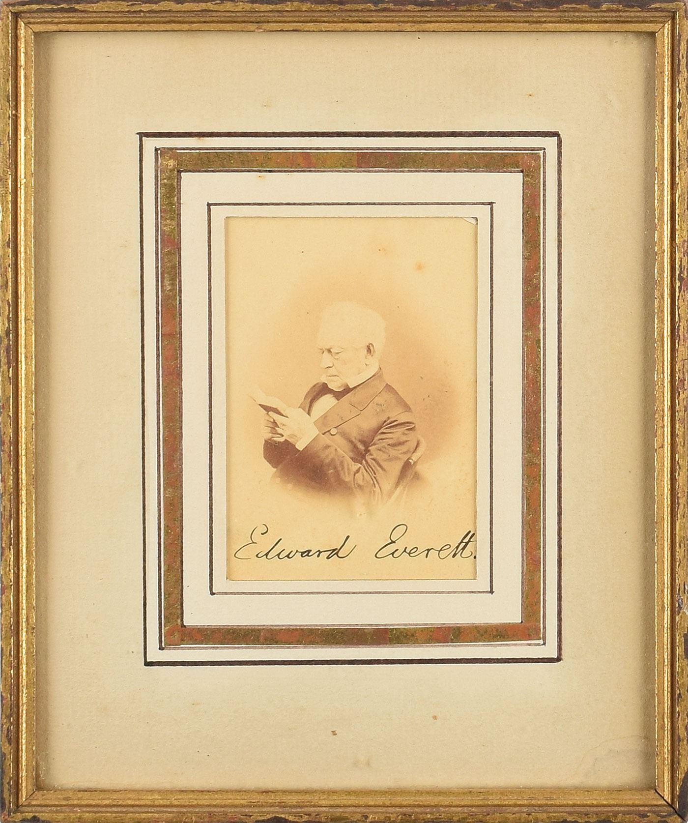 American statesman (1794–1865) renowned for his oratory, best remembered for giving the speech preceding Lincoln's Gettysburg Address. Uncommon 2.25 x 3.25 albumen portrait of Everett reading a book, neatly signed in ink, "Edward Everett." Matted and framed to an overall size of 6 x 7.5. In fine condition.
