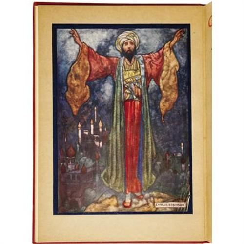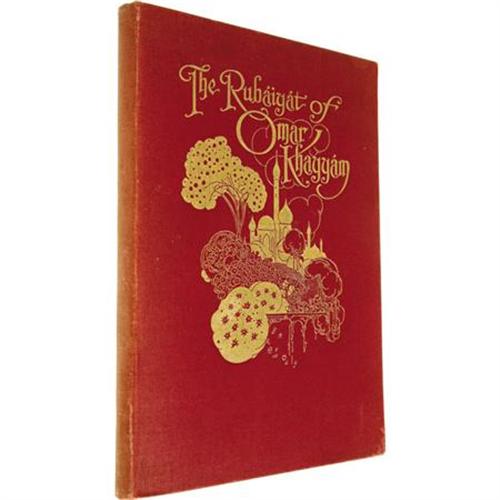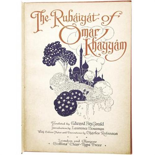 <B>Edward Fitzgerald Translator : </B></I><B><I>The Rubáiyát of Omar Khayyám</B></I></B></I><B>.</B></I> Introduction by Laurence Housman with Colour Plates and Decorations by Charles Robinson. (London and Glasgow: Collins Clear-Type Press, nd), 56 pages, four tipped-in color plates, red cloth with gilt decoration, all edges gilt, 4to (8" x 11"). A handsome edition of the best-known English translation from the original Persian of mathematician and astronomer Omar Khayyám's (1048-1123) poetry. The word <I>rubáiyát</B></I> is derived from the Arabic root for four and means "quatrains," or verses of four lines. Condition is good, corner damage to the frontis plate, text block is tender. <BR><BR><b>Shipping:</b> Books & Catalogs (<a target="_blank" href="http://www.heritageauctions.com/common/shipping.php">view shipping information</a>)