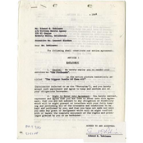 <B>Edward G. Robinson Signed Contract.</B></I> A 24-page employment contract dated May 6, 1966, and signed by the actor in blue ink on the last page. the agreement employed Robinson for the role of "the Professor" in the 1968 comedy <I>The Biggest Bundle of Them All.</B></I> In Very Fine condition with mild wear and the usual staple and binder holes.<BR><BR><b>Shipping:</b> Flat Material, Small (<a target="_blank" href="http://www.heritageauctions.com/common/shipping.php">view shipping information</a>)
