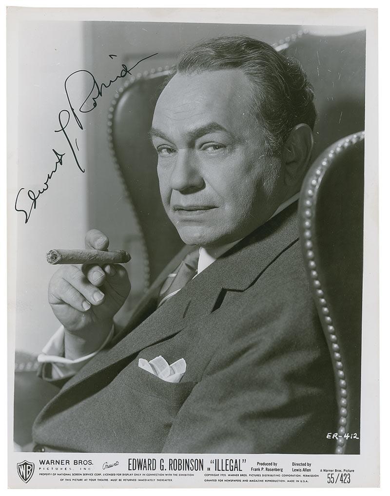 Vintage glossy 8 x 10 Warner Bros. promotional photo for Illegal, signed in fountain pen. Some light edge and corner creases, and a few scattered light surface marks, otherwise fine condition.