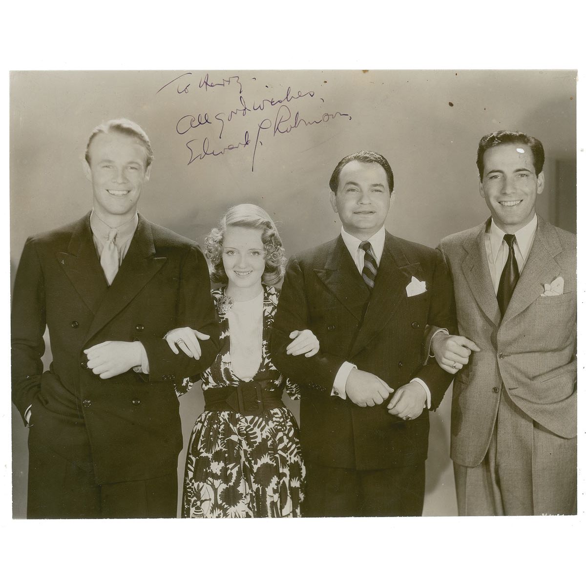 Early vintage glossy 9.25 x 7.25 photo of Robinson, Bette Davis, Humphrey Bogart, and one other, signed and inscribed in fountain pen, “To Harry, All good wishes, Edward G. Robinson.” In very good condition, with scattered surface marks, some light rubbing, a small tear to the top right corner, a small hole through the top of Bogart’s head, label remnants on reverse, and trimmed edges. Stamp on reverse indicates photo came from Harry Wilkinson’s “Hollywood Amuseum of Memories,” Marblehead, Massachusetts.