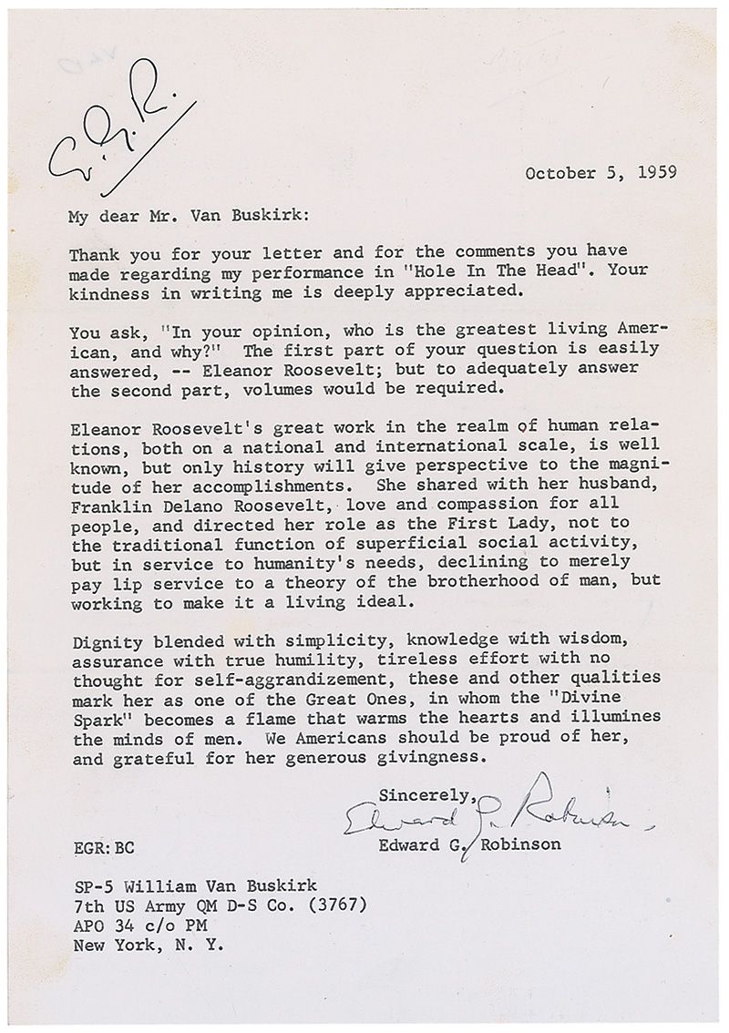 TLS, one page, 7 x 10, personal letterhead, October 5, 1959. Letter to an admirer. In part: “You ask, ‘In your opinion, who is the greatest living American and why?’ The first part of your question is easily answered,––Eleanor Roosevelt; but to adequately answer the second part, volumes would be required. Eleanor Roosevelt’s great work in the realm of human relations, both on a national and international scale, is well known, but only history will give perspective to the magnitude of her accomplishments. She shared with her husband…love and compassion for all people, and directed her role as the First Lady, not to the traditional function of superficial social activity, but in service to humanity’s needs, declining to merely pay lip service to a theory of the brotherhood of man, but working to make it a living ideal…we Americans should be proud of her, and grateful for her generous givingness.” In fine condition, with a light vertical fold through a single letter of signature and a bit of trivial soiling. An insightful and articulate letter from the actor who would appropriately receive the first Eleanor Roosevelt Humanities Award four years later in 1963.