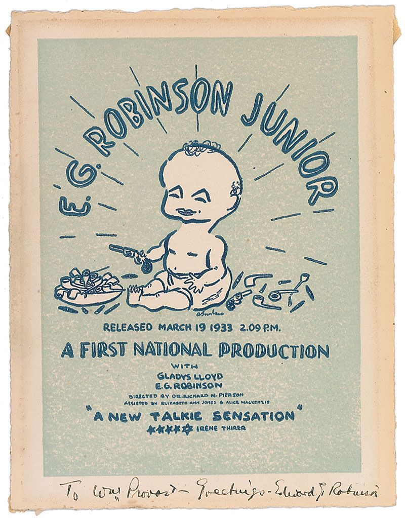 Comical baby announcement for the birth of Edward G. Robinson, Jr., 5 x 6.5, designed to look like a film poster, signed and inscribed along the bottom edge, “To Wm. Provost—Greetings, Edward G. Robinson.” In fine condition.