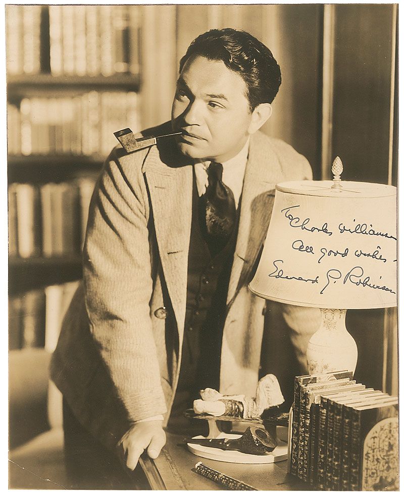 Vintage matte-finish 7.25 x 9 photo of a young Robinson enjoying a pipe, signed and inscribed in fountain pen, “To Charles Williamson, All good wishes, Edward G. Robinson.” Trimmed edges and a crease to lower left corner, otherwise fine condition.