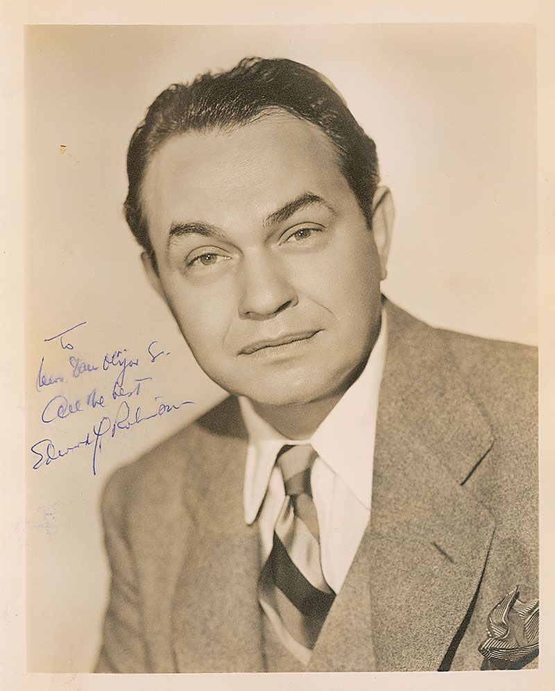 Vintage matte-finish 8 x 10 head-and-shoulders photo of Robinson in a classy suit and tie, signed and inscribed in blue ink, “To Mrs. Dan Olijar, Sr., All the best, Edward G. Robinson.” In very good condition, with moderate rippling to edges and overall brushing to ink.