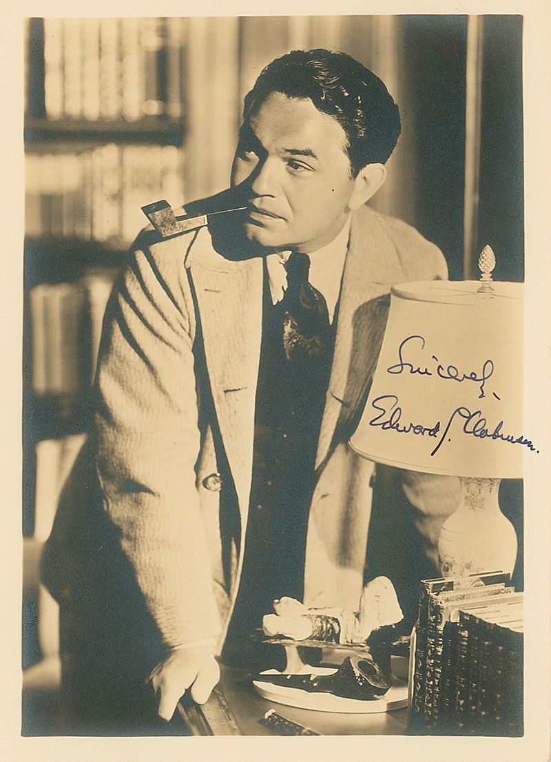 Vintage matte-finish 5 x 7 photo of a younger Robinson enjoying a pipe, signed in fountain pen, “Sincerely, Edward G. Robinson.” A horizontal crease to lower portion of image and some scattered light silvering, otherwise fine condition.