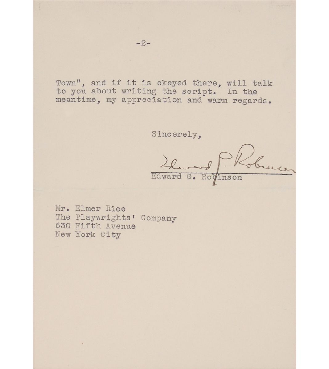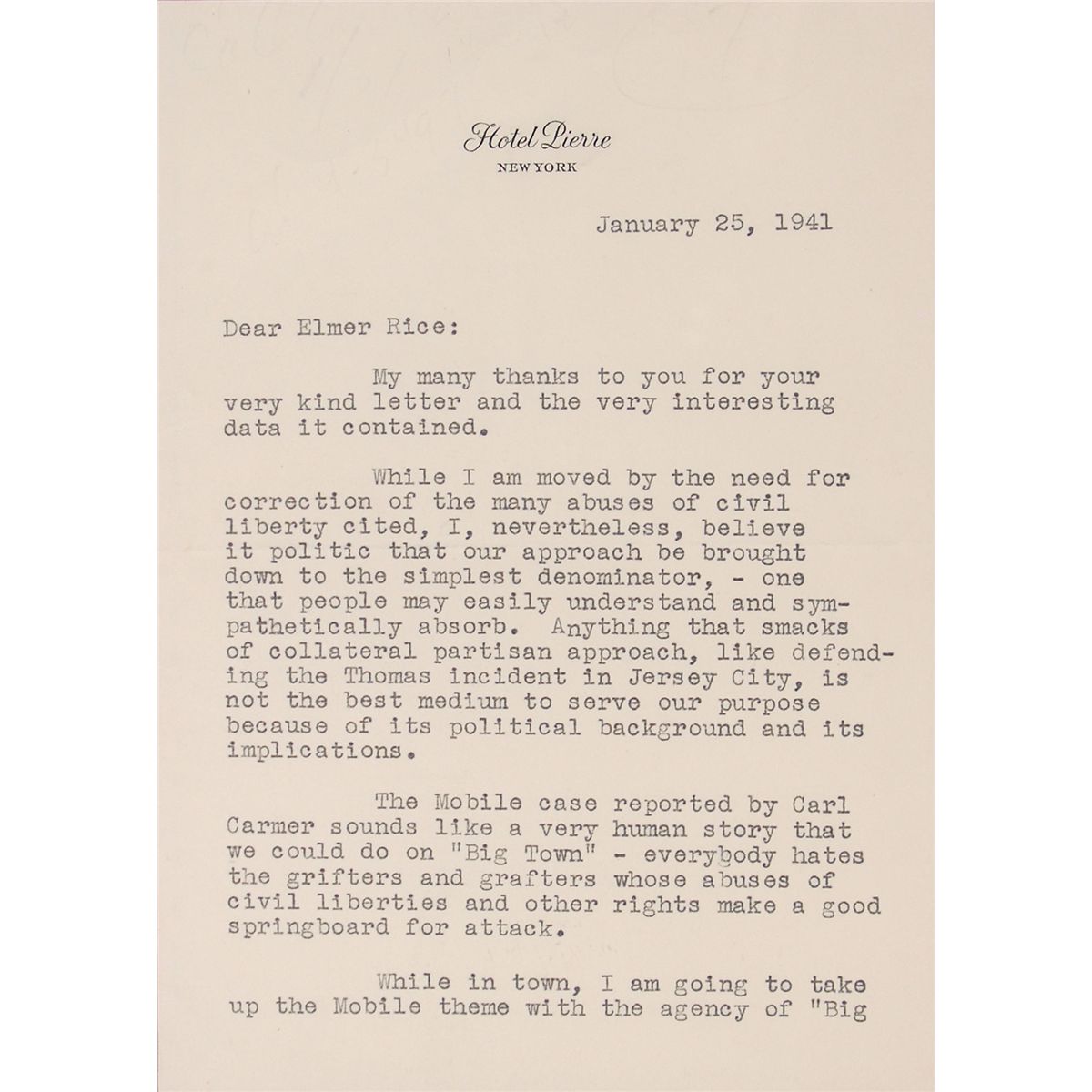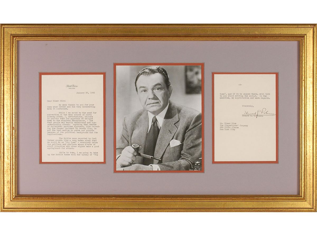 TLS, two pages, 5.25 x 7.5, Hotel Pierre, New York letterhead, January 25, 1941. Letter to Elmer Rice at the Playwrights’ Company in New York. In part: “While I am moved by the need for correction of the many abuses of civil liberty cited, I…believe it politic that our approach be brought down to the simplest denominator, one that people may easily understand and sympathetically absorb. Anything that smacks of collateral partisan approach, like defending the Thomas case in Jersey City, is not the best medium to serve our purpose because of its political background and its implications. The Mobile case…sounds like a very human story that we could do on ‘Big Town’—everybody hates the grifters and grafters whose abuses of civil liberties and other rights make a good springboard for attack.” Handsomely double-matted and framed with a portrait of the actor to an overall size of 27 x 16. In fine condition. Oversized.