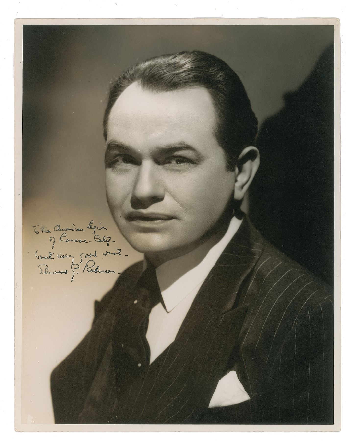 Handsome oversized vintage matte-finish 11 x 14 portrait of Robinson in a pinstriped suit and tie, wonderfully capturing his classic tough-guy visage, signed and inscribed in fountain pen, "To the American Legion of Roscoe, Calif., with every good wish, Edward G. Robinson.” In fine condition, with light edge rippling.