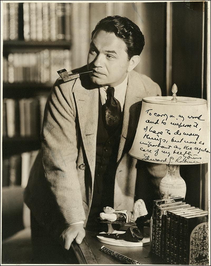 Vintage matte-finish 7.5 x 9.5 photo of Robinson smoking a pipe while leaning against a desk, signed in black fountain pen, “To carry on my work and to improve it, I have to do many things, but none so important as the regular care of my teeth. Yours, Edward G. Robinson.” In very good condition, with scattered creasing, mounting remnants on the back, and a small piece of old tape (from past mounting) at the upper right corner. Pre-certified PSA/DNA and RRAuction COA.
