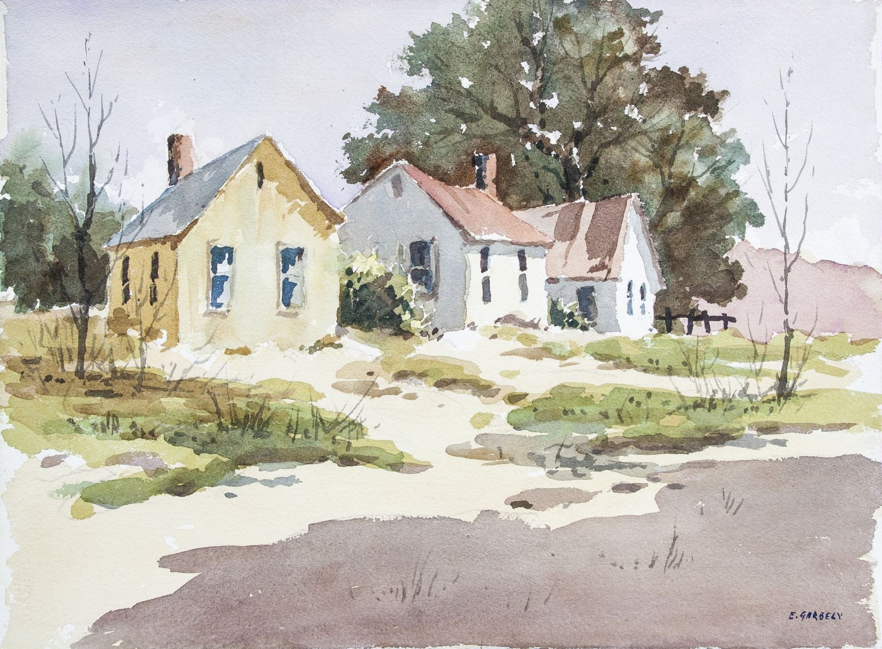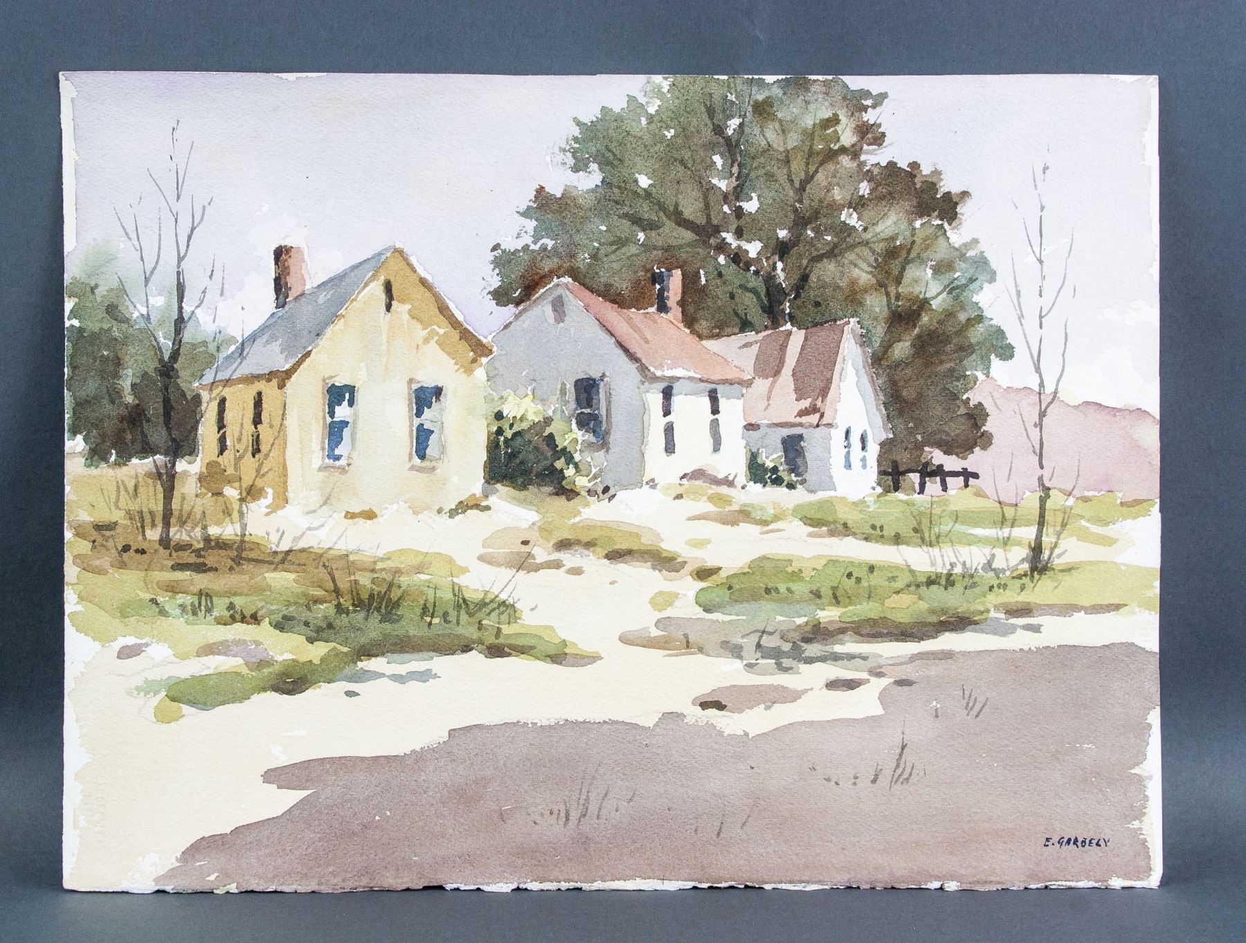 Watercolor on paper. Featuring landscape painting. Signed by Edward Garbely 1908-1999 American on lower right corner. 11.25 x 15 inches (28.6 x 38.1 cm). Edward Garbely was born on August 15, 1908 in Newark, New Jersey. He was best known for his harbor scenes, seascapes, landscapes. He studied at the Newark School of Fine & Industrial Art, including with John R. Grabach, A. H. Trouck, and Alexander Baranowski. He also studied with noted artist Emil Gruppe and NY artist Dorothy Koppelman. He was a member of the New Jersey Society of Painters & Sculptors, the East Orange Art Club, (showing 500 of 1431 characters). PROVENANCE: Private collection, Ohio, United States