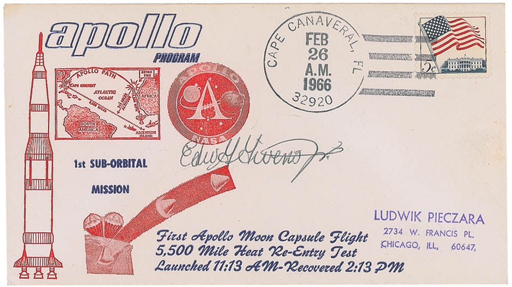 Group 5 astronaut (1930–1967) who briefly served on the Apollo 7 support crew before being killed in an automobile accident. Scarce commemorative cover with a cachet honoring the first Apollo sub-orbital mission, signed in black ballpoint, “Edw G. Givens Jr.” In fine condition. Due to his untimely death, Givens is one of the toughest astronaut signatures to acquire.