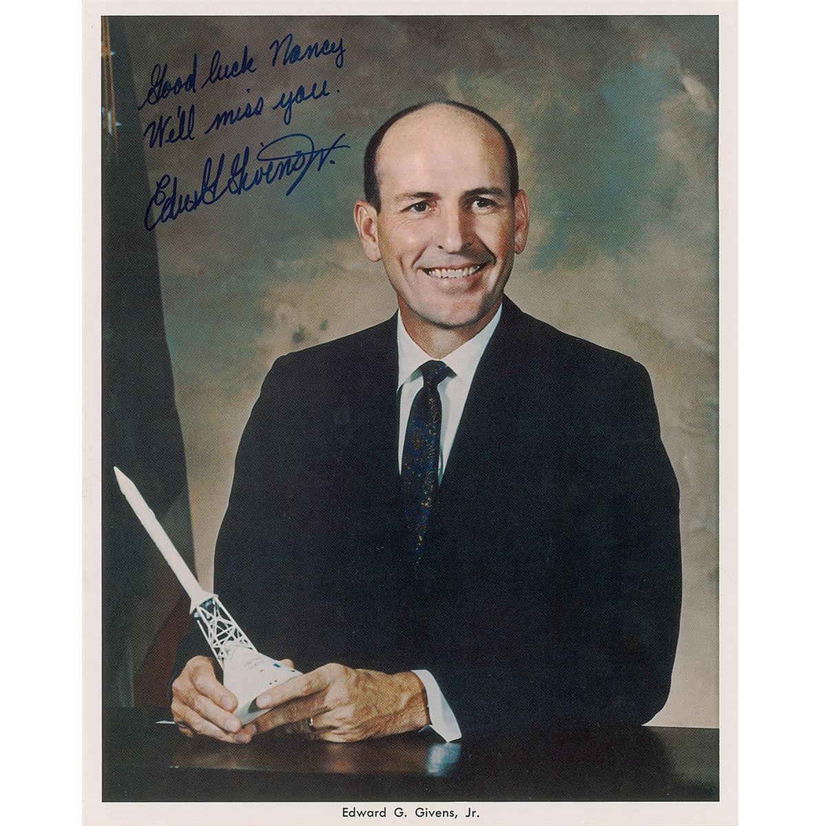 Group 5 astronaut (1930–1967) who briefly served on the Apollo 7 support crew before being killed in an automobile accident. Superlative color vintage 8 x 10 NASA photo of Givens posing with a model capsule, boldly signed and inscribed in blue felt tip “Good luck Nancy, We’ll miss you, Edward Givens, Jr.” In fine condition. Givens is one of the most difficult astronaut autographs to acquire, especially in signed photos—this is the only one we have ever encountered. A superb portrait with a flawless signature, this must be one of the finest Givens items extant.