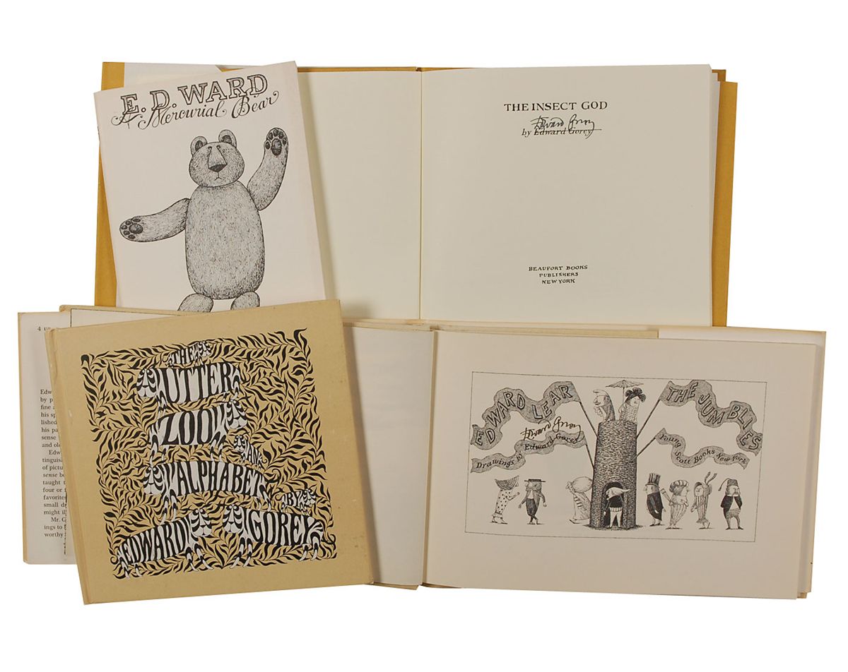 Four books: hardcover editions of The Utter Zoo Alphabet, The Insect God, and The Jumblies, each signed in black ink on the title page by Gorey, who has crossed out his printed name as author; and one softcover edition of A Mercurial Bear, signed on the back cover with his pseudonym, “Dogear Wryde,” also crossing out his printed name. In overall fine condition, with a couple tears and clipped corners to dust jackets.