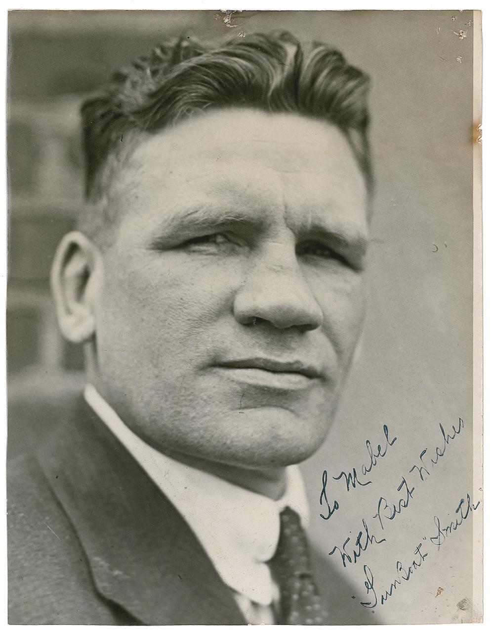 Boxer and referee (1887–1974) considered one of the ‘White Hope’ boxers of the early 1900s. Vintage glossy 7 x 9 portrait, signed and inscribed in fountain pen “To Mabel, With Best Wishes, ‘GunBoat’ Smith.” In very good condition, with scattered creasing and surface marks, slight rippling, several pin holes around the edges, rust stains around a few of the holes, and trimmed edges. A desirable and seldom-seen pugilistic signature.