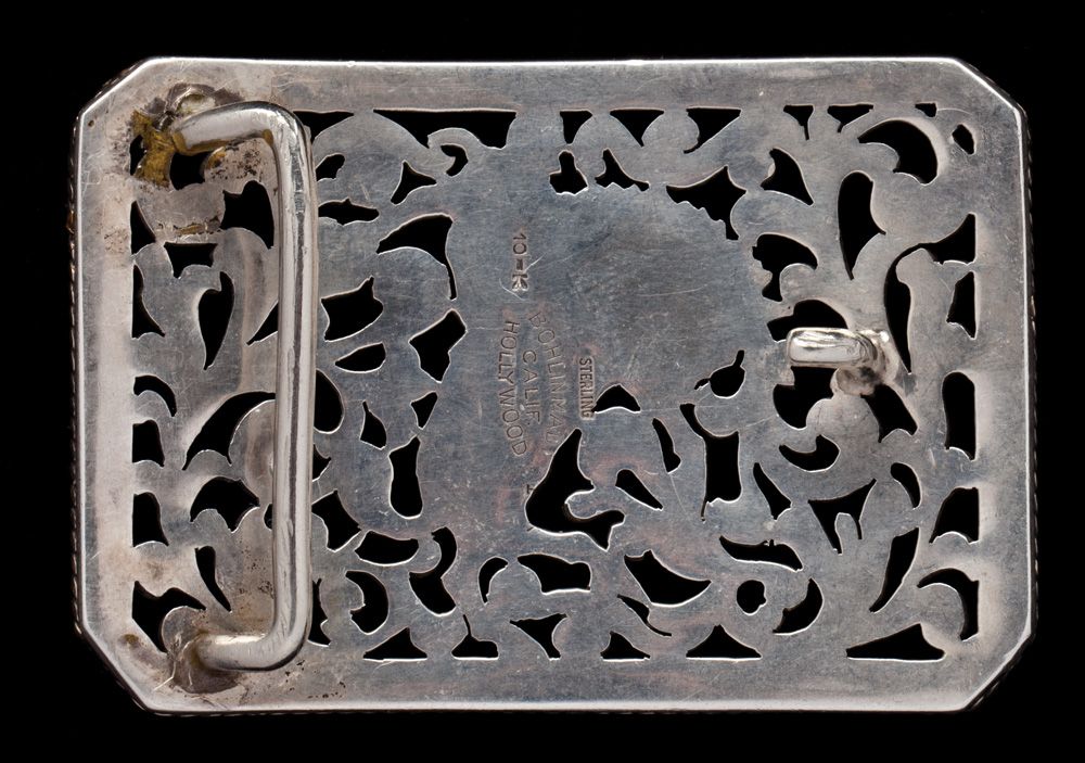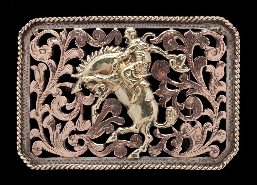 Very fine belt buckle with early Bohlinmade – Hollywood football mark, 10K 2-color gold and sterling, gold rope edge and overlaid classic high relief Bohlin rearing horse. 2 1/4” x 3 1/4”.
