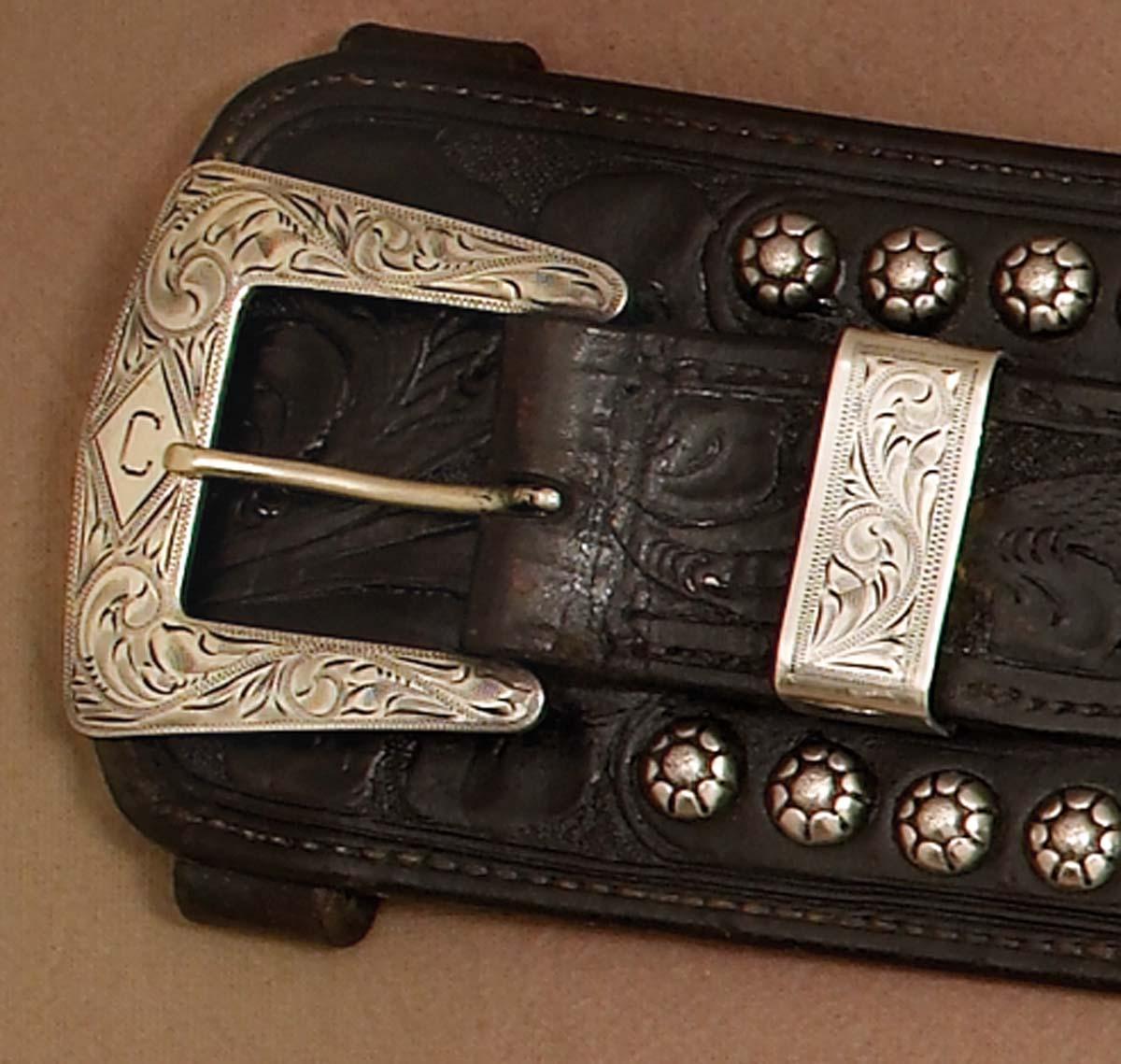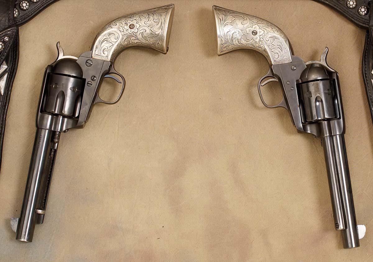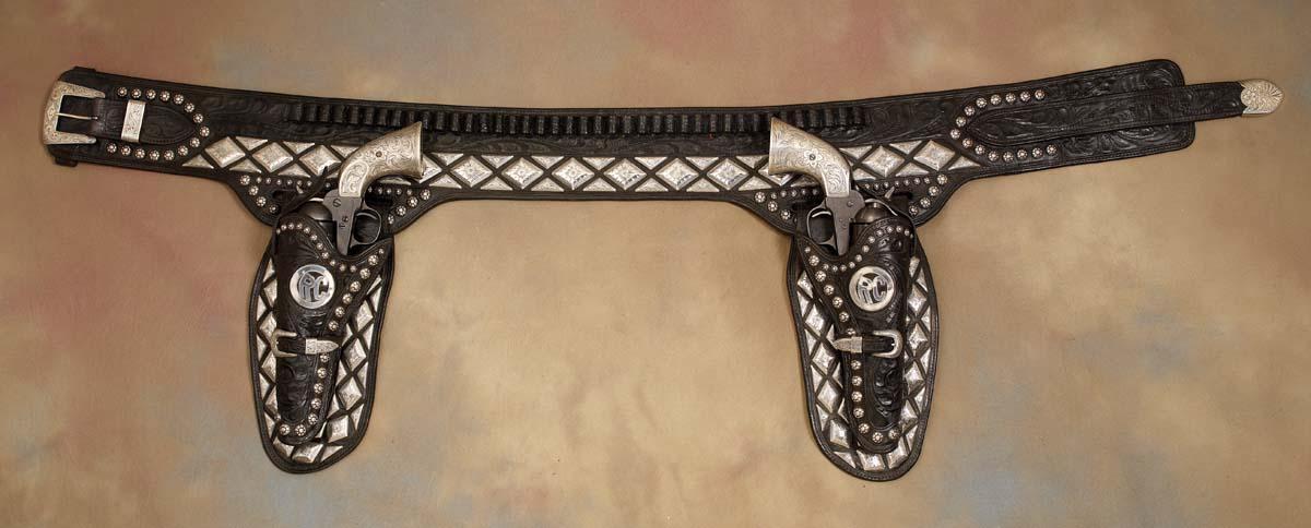 Maker-marked Edward H Bohlin, Hollywood double buscadero gun rig with a pair of 1880s Colt .45 SA serial #103401 and #100072 with silver Bohlin style gun grips. Rig adorned with engraved sterling silver diamond and half-diamond conchos with small and larger spots plus the initials RC (Rory Calhoun?) cut-out in silver on both holsters. Rig measures 44" overall with appx 40" from the 1 1/2" sterling buckle to the middle belt loop. The letter C engraved on all buckles. Both guns are re-blued. 5 1/2" .45 cal Colt SA