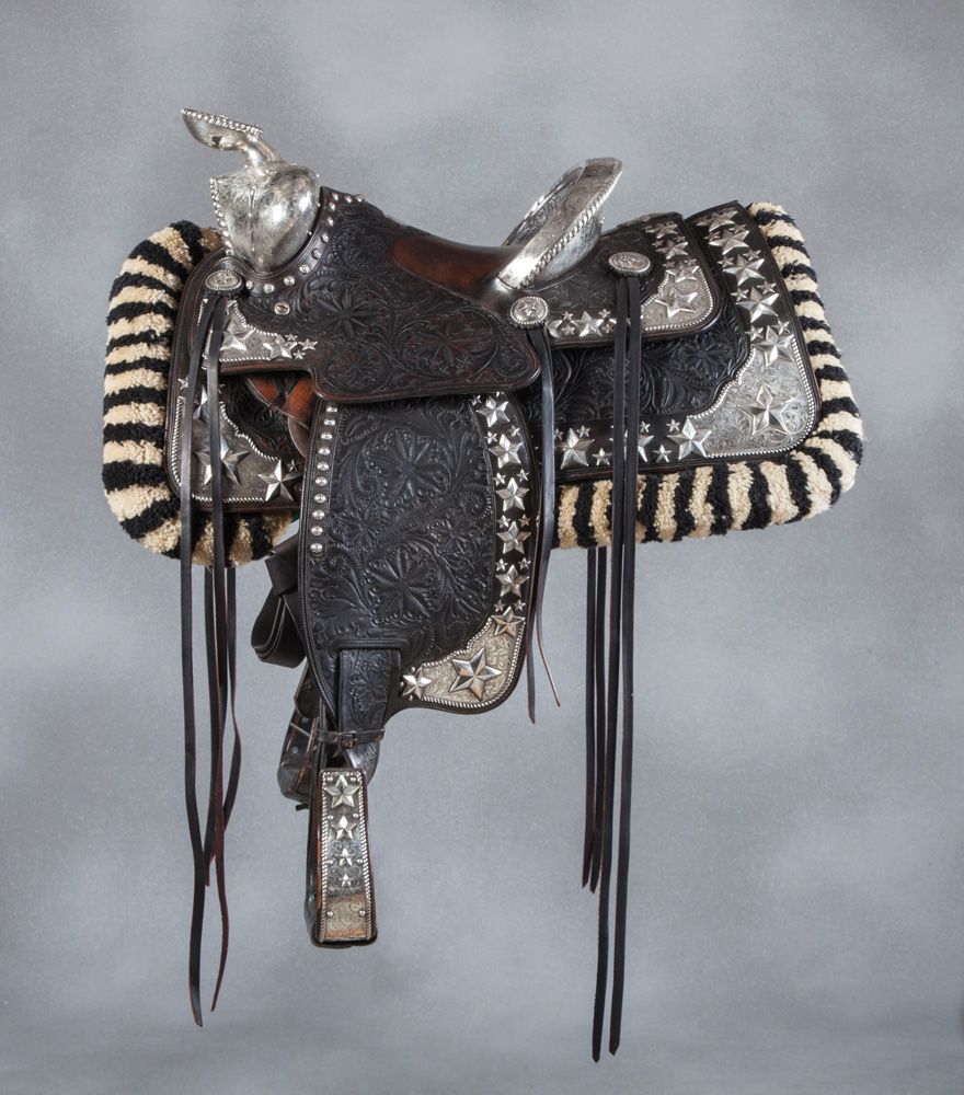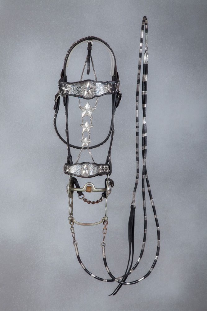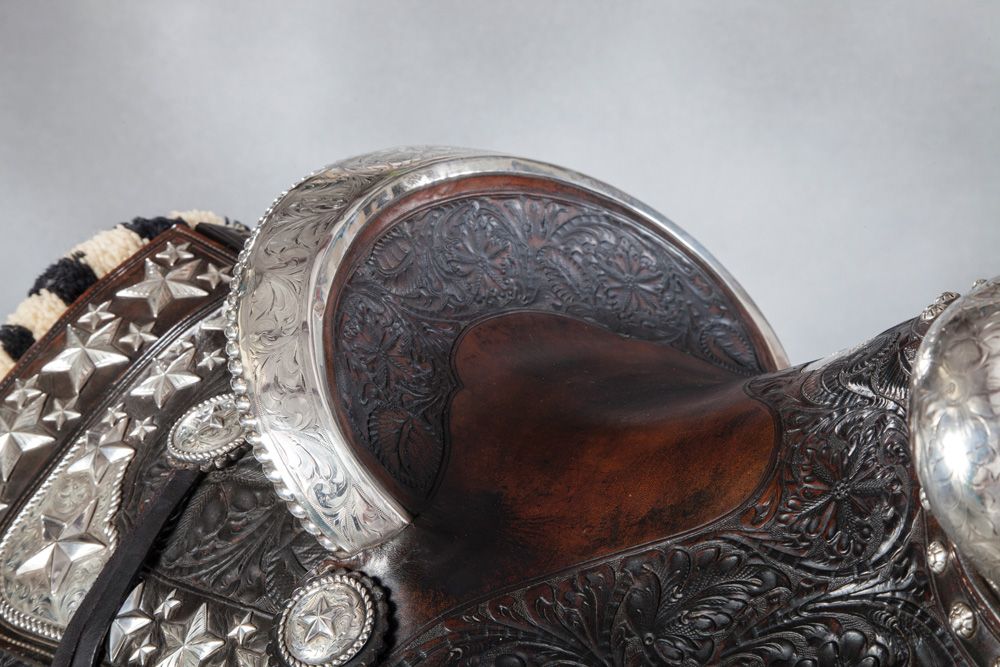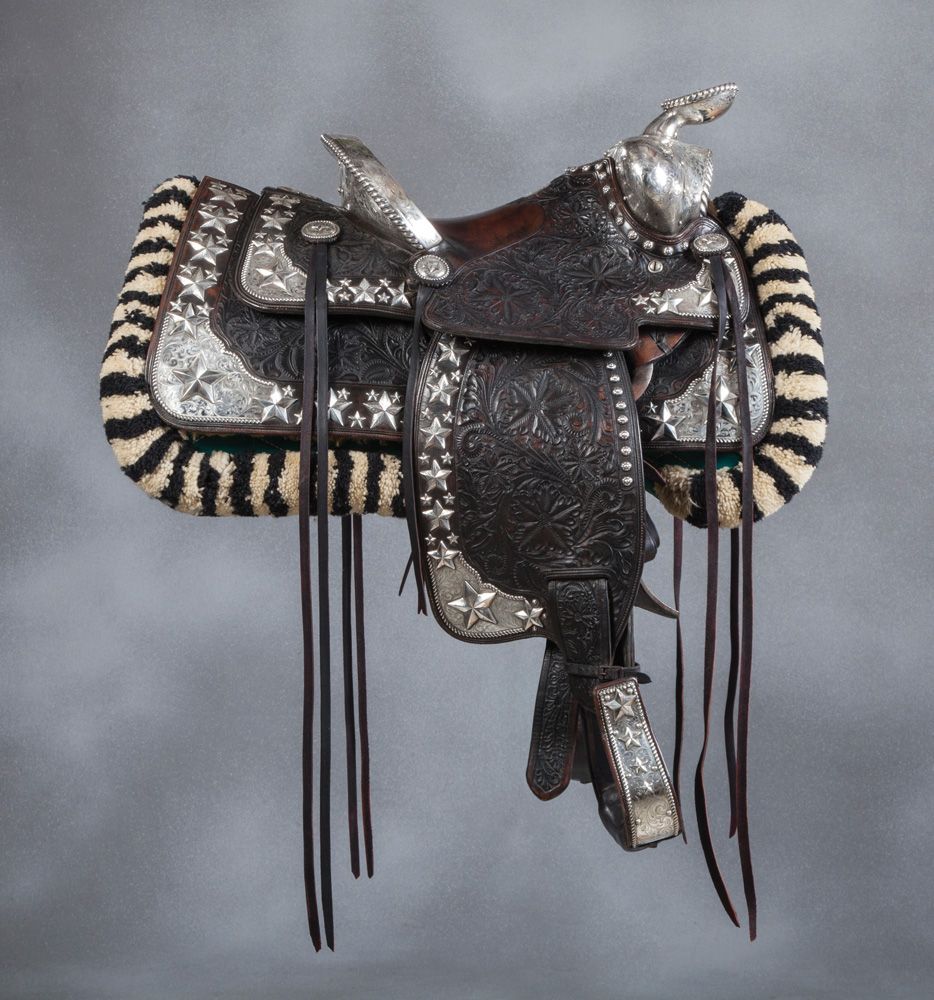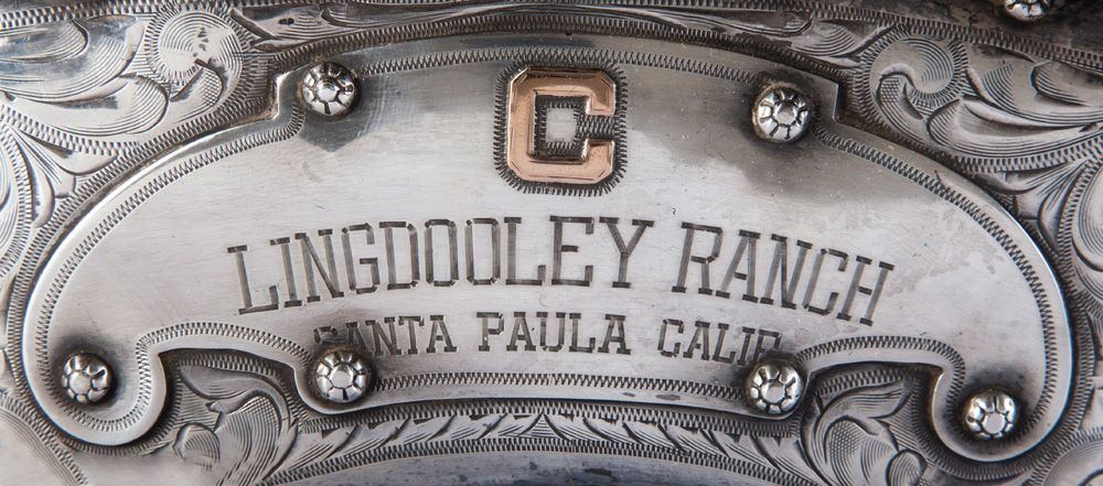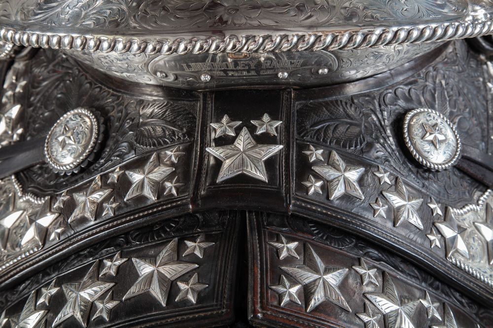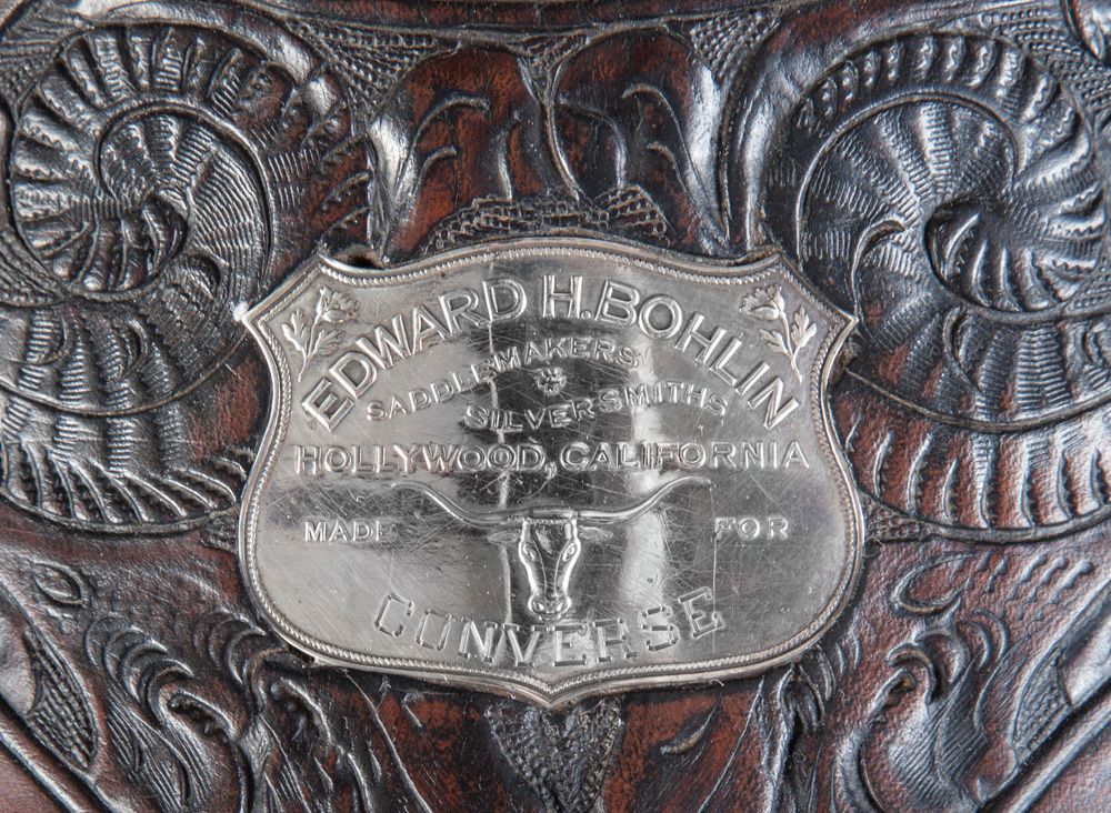 Edward H. Bohlin "Lone Star" Parade Saddle. We are very proud to present the seldom seen Edward H. Bohlin, Hollywood, California "Lone Star" model sterling silver mounted Parade saddle with matching Bohlin Bridle and Breast Collar. This Lone Star is made on the Bob Crosby saddle tree with 13" swells, 3" cantle and features an oblong pelican horn. The saddle is fully floral carved and mounted with heavy gauge, intricately engraved sterling silver mountings featuring raised Texas stars in a various sizes from 1/2" to 2 1/2". The Cheyenne roll cantle has twisted rope edge and is fully encased in silver. The Breast Collar and Bridle replicate the Lone Star motif and includes a Visalia maker-marked humane polo bit with engraved scalloped conchos plus split reins and romal adorned with silver ferrules. The Bohlin Seat Plate is engraved with the name CONVERSE and the rear cantle plate has the raised name of LINGDOOLEY RANCH / Santa Paula, Calif. The original black and white wool corona is included. Other than some minor age cracking, the saddle is in overall very good condition, circa 1940. Lot includes copies of "parade wear’" photos of Dianna Converse at the Santa Barbara Horse Show in 1942 -- both in the newspaper clipping and the photograph, plus copies of other photos of her in show apparel. Lot also includes:. (b) Turk blue wool Parade Outfit with red and green flowers, rhinestones and matching Serape;. (c) Keyston Bros, San Francisco sterling & 14k horsehead buckle on floral carved belt. All photos and newspaper articles are COPIES. PROVENANCE: By descent through the family of Dianna Converse of Santa Paula, daughter of a prosperous family from the Boston area, founders of the Converse Rubber and Shoe Co -- later becoming the Converse Shoe Company that was purchased by Nike in 2003. Dianna was also well known in the flying community for her early speed record flights and her around the world speed record attempt that was sponsored by Flying Tigers Air Cargo line. Her family had a large citrus/avocado farm and horse ranch in Santa Paula called the Lingdooley Ranch where they bred, trained, and sold horses, and took part in various parades and shows in the area including Santa Barbara Spanish Days. Dianna, tragically, died at the age of 33 (1955) during a cargo flight to Mexico. She has been written about by several authors including Claudine Burnett's "Soaring Skyward", a copy of which is included with the lot.
