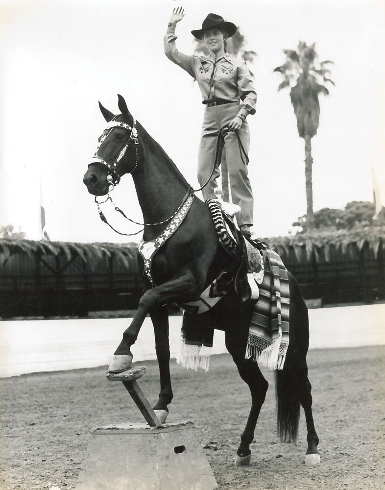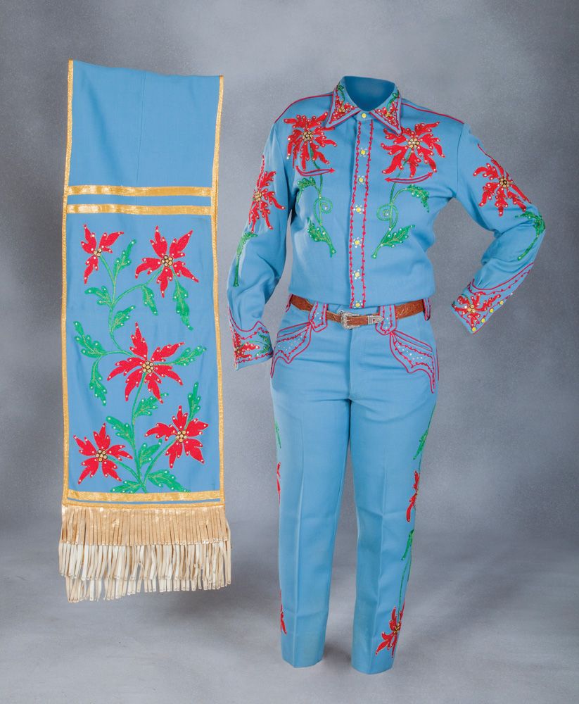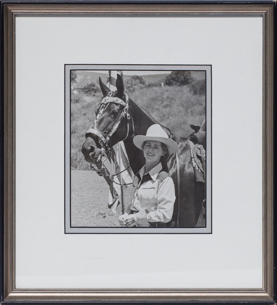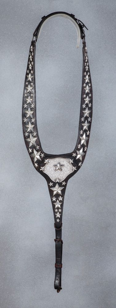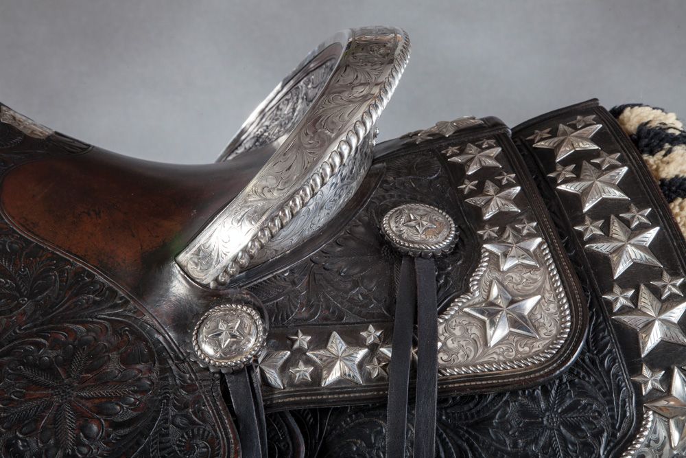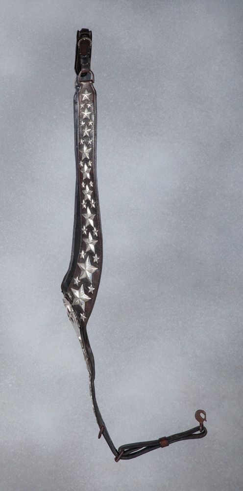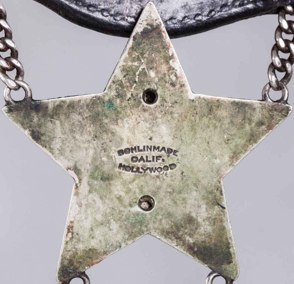 Edward H. Bohlin "Lone Star" Parade Saddle. We are very proud to present the seldom seen Edward H. Bohlin, Hollywood, California "Lone Star" model sterling silver mounted Parade saddle with matching Bohlin Bridle and Breast Collar. This Lone Star is made on the Bob Crosby saddle tree with 13" swells, 3" cantle and features an oblong pelican horn. The saddle is fully floral carved and mounted with heavy gauge, intricately engraved sterling silver mountings featuring raised Texas stars in a various sizes from 1/2" to 2 1/2". The Cheyenne roll cantle has twisted rope edge and is fully encased in silver. The Breast Collar and Bridle replicate the Lone Star motif and includes a Visalia maker-marked humane polo bit with engraved scalloped conchos plus split reins and romal adorned with silver ferrules. The Bohlin Seat Plate is engraved with the name CONVERSE and the rear cantle plate has the raised name of LINGDOOLEY RANCH / Santa Paula, Calif. The original black and white wool corona is included. Other than some minor age cracking, the saddle is in overall very good condition, circa 1940. Lot includes copies of "parade wear’" photos of Dianna Converse at the Santa Barbara Horse Show in 1942 -- both in the newspaper clipping and the photograph, plus copies of other photos of her in show apparel. Lot also includes:. (b) Turk blue wool Parade Outfit with red and green flowers, rhinestones and matching Serape;. (c) Keyston Bros, San Francisco sterling & 14k horsehead buckle on floral carved belt. All photos and newspaper articles are COPIES. PROVENANCE: By descent through the family of Dianna Converse of Santa Paula, daughter of a prosperous family from the Boston area, founders of the Converse Rubber and Shoe Co -- later becoming the Converse Shoe Company that was purchased by Nike in 2003. Dianna was also well known in the flying community for her early speed record flights and her around the world speed record attempt that was sponsored by Flying Tigers Air Cargo line. Her family had a large citrus/avocado farm and horse ranch in Santa Paula called the Lingdooley Ranch where they bred, trained, and sold horses, and took part in various parades and shows in the area including Santa Barbara Spanish Days. Dianna, tragically, died at the age of 33 (1955) during a cargo flight to Mexico. She has been written about by several authors including Claudine Burnett's "Soaring Skyward", a copy of which is included with the lot.