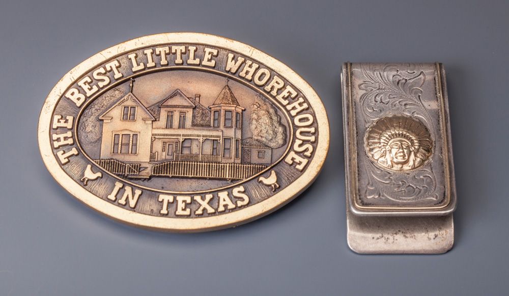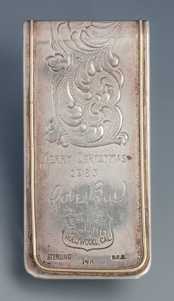 Edward H. Bohlin Money Clip from Burt Reynolds, and Brass Belt Buckle. Edward H. Bohlin, Hollywood, sterling silver and 14k gold Indian head money clip. Gifted for Christmas (1983) to Tom Mount, head of motion picture production at Universal Studios, by Burt Reynolds following the filming of the "Best Little Whorehouse in Texas. Inscribed on reverse "Merry Christmas 1983 / Love Burt ". Money clip measures 3 5/8" x 1 1/4" with the Bohlin shield, marked Sterling, 14K, S.E.B. Reynolds was a part-owner of the Bohlin company during the early 1980s. Included in the lot is a cast brass belt buckle from the film, 2 1/2" x 3 1/2".