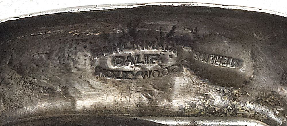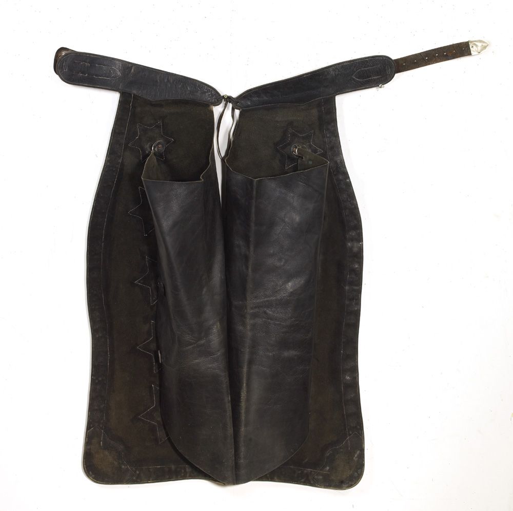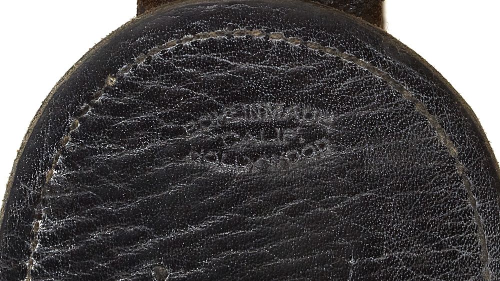 Regal Machris Deluxe starburst pattern measuring 41” in length, maker-marked on the buckle and twice in the leather. Floral carved billet and belt. Adorned with hundreds of alternating leaf and round conchos. The Machris has always been considered by Bohlin aficionados to be one of saddlemaker to the stars’ most most artistic creations. Fine condition, c 1940s