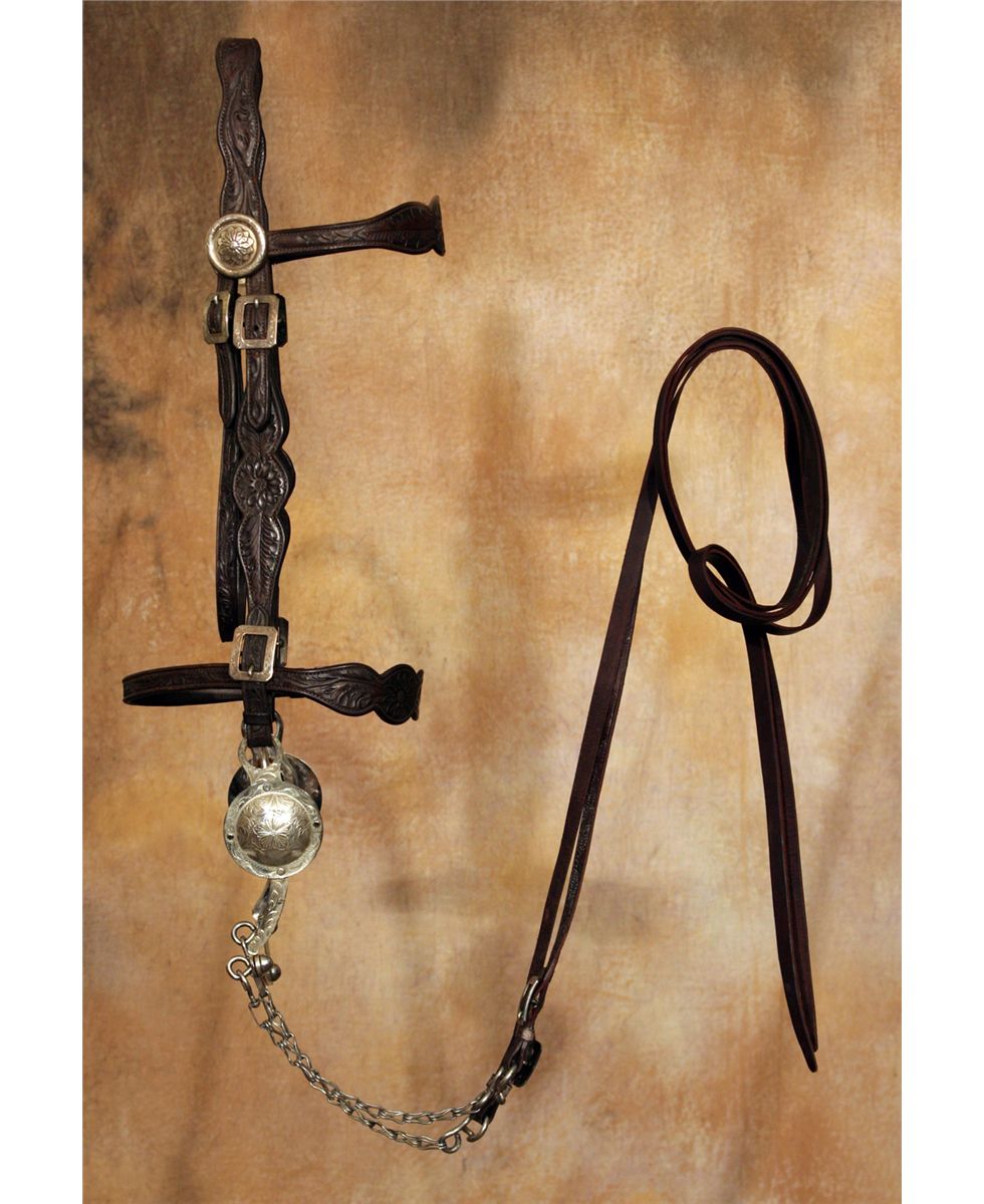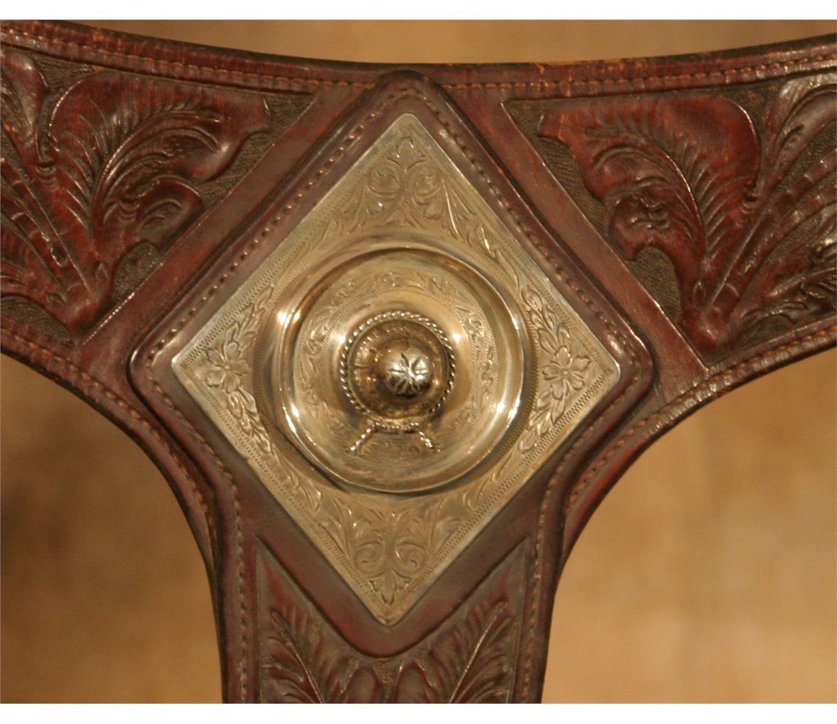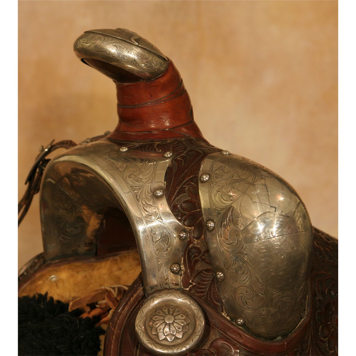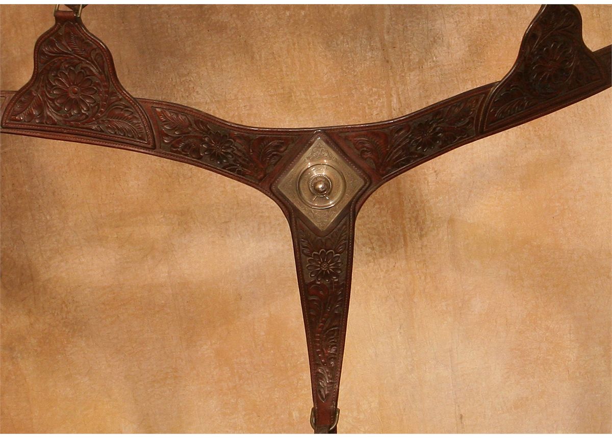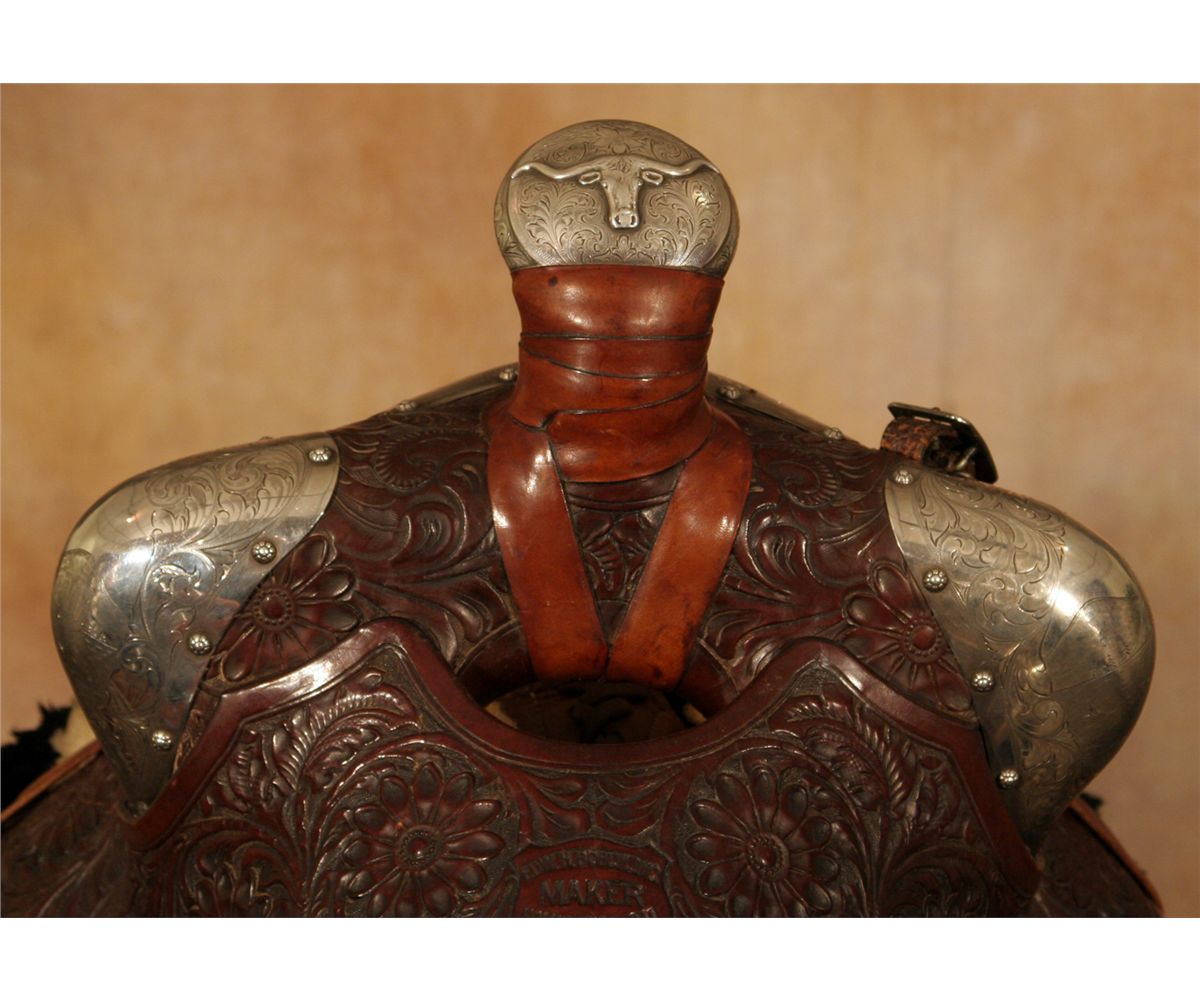Edward H. Bohlin Silver Mounted Parade Ensemble. Exceptional tooled brown leather with classically styled Bohlin silver. Includes matching bridle, reins, martingale, saddlebags, cinch and corona. Engraved cantle plate: Rudolph C. J. Fritsch, Miami Beach, FL. 15" seat with a Cheyenne roll cantle. Circa 1950s. Provenance: Collection of Dr. Delwin and Karen Bokelman, PA., and pictured in their book Precious Dreams, page 68.