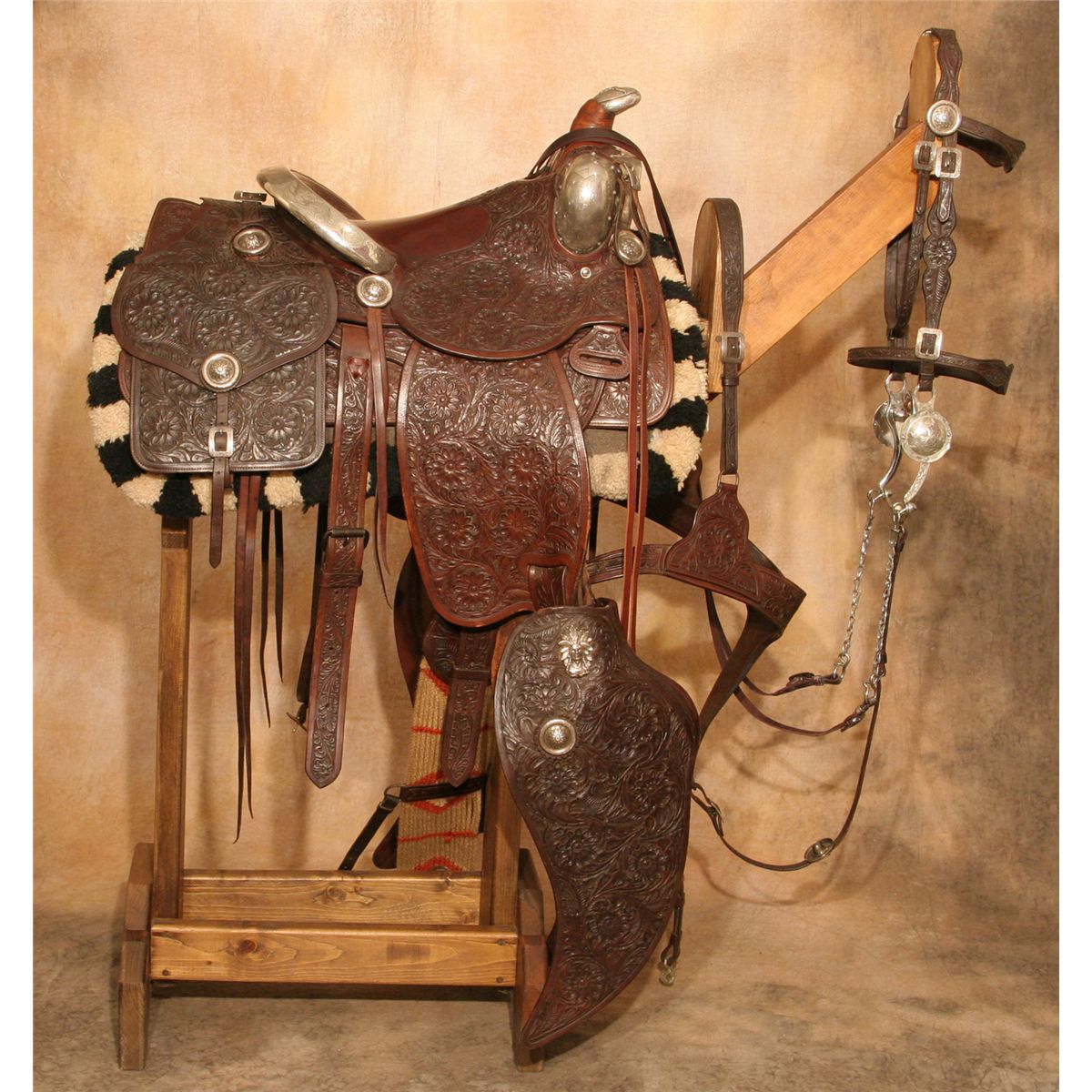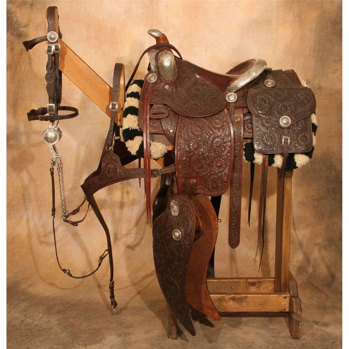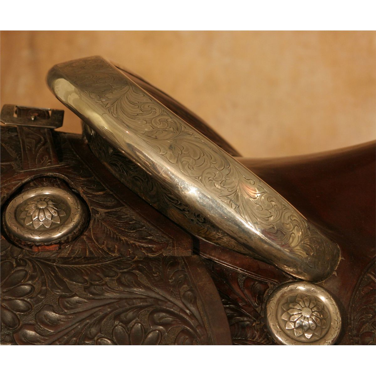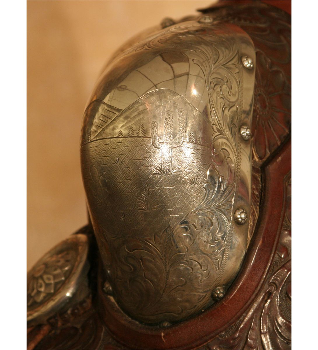 Edward H. Bohlin Silver Mounted Parade Ensemble. Exceptional tooled brown leather with classically styled Bohlin silver. Includes matching bridle, reins, martingale, saddlebags, cinch and corona. Engraved cantle plate: Rudolph C. J. Fritsch, Miami Beach, FL. 15" seat with a Cheyenne roll cantle. Circa 1950s. Provenance: Collection of Dr. Delwin and Karen Bokelman, PA., and pictured in their book Precious Dreams, page 68.