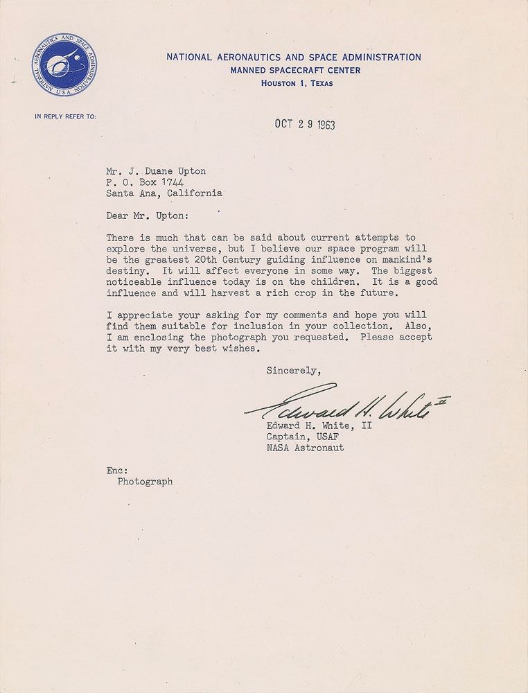 TLS signed “Edward H. White II,” one page, 8 x 10.5, NASA letterhead, October 29, 1963. Letter to J. Duane Upton, in part: "There is much that can be said about current attempts to explore the universe, but I believe our space program will be the greatest 20th Century guiding influence on mankind’s destiny. It will affect everyone in some way. The biggest noticeable influence today is on the children. It is a good influence and will harvest a rich crop in the future. I appreciate your asking for my comments and hope you will find them suitable for inclusion in your collection." In fine condition. An exquisite letter offering an insightful view of the 'Space Race' by one of America's most significant early astronauts. White became the first American to perform a spacewalk in 1965, and would be killed in the tragic Apollo 1 fire—his sacrifice led directly to many of the safety measures put in place for the moon landing missions. The phenomenal content of this letter rings true today—the American space program not only drove major advances in technology, but offered inspiration for children around the world.