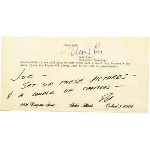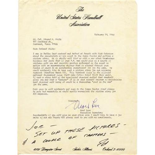 <B>Edward H. White II Autograph Note Signed</B></I> "<I>Ed,</B></I>" at bottom of letter to him. Typed Letter Signed "<I>Mort Love</B></I>" as Executive Secretary, The United States Handball Association, one page, 8.5" x 11". Skokie, Illinois, February 19, 1966. To Lt. Col. Edward H. White, about a possible article to be published in the U.S.H.A. national tournament issue. In part, "<I>If your P.R. man could give us a couple of pictures with you and possibly another astronaut in the court in action with an accompanying writeup that is cleared through your Center it would do an outstanding promotional job for the game…If such a story is told of the beneficial physical outlet that handball gives you and what a 'natural' it is in your overall program of maintaining real physical well being it would be a tremendous 'shot in the arm' for the game…</B></I>" White has sent this letter to Joe Garino with this handwritten note at the bottom "<I>Joe- Set up these pictures - & a couple of captions. - Ed.</B></I>" <I>From the collection of renowned former physical trainer of the astronauts Joe Garino. This lot is accompanied by a signed certificate of authentication from Garino verifying its provenance.</B></I><BR><BR><b>Shipping:</b> Flat Material, Small (<a target="_blank" href="http://www.heritageauctions.com/common/shipping.php">view shipping information</a>)