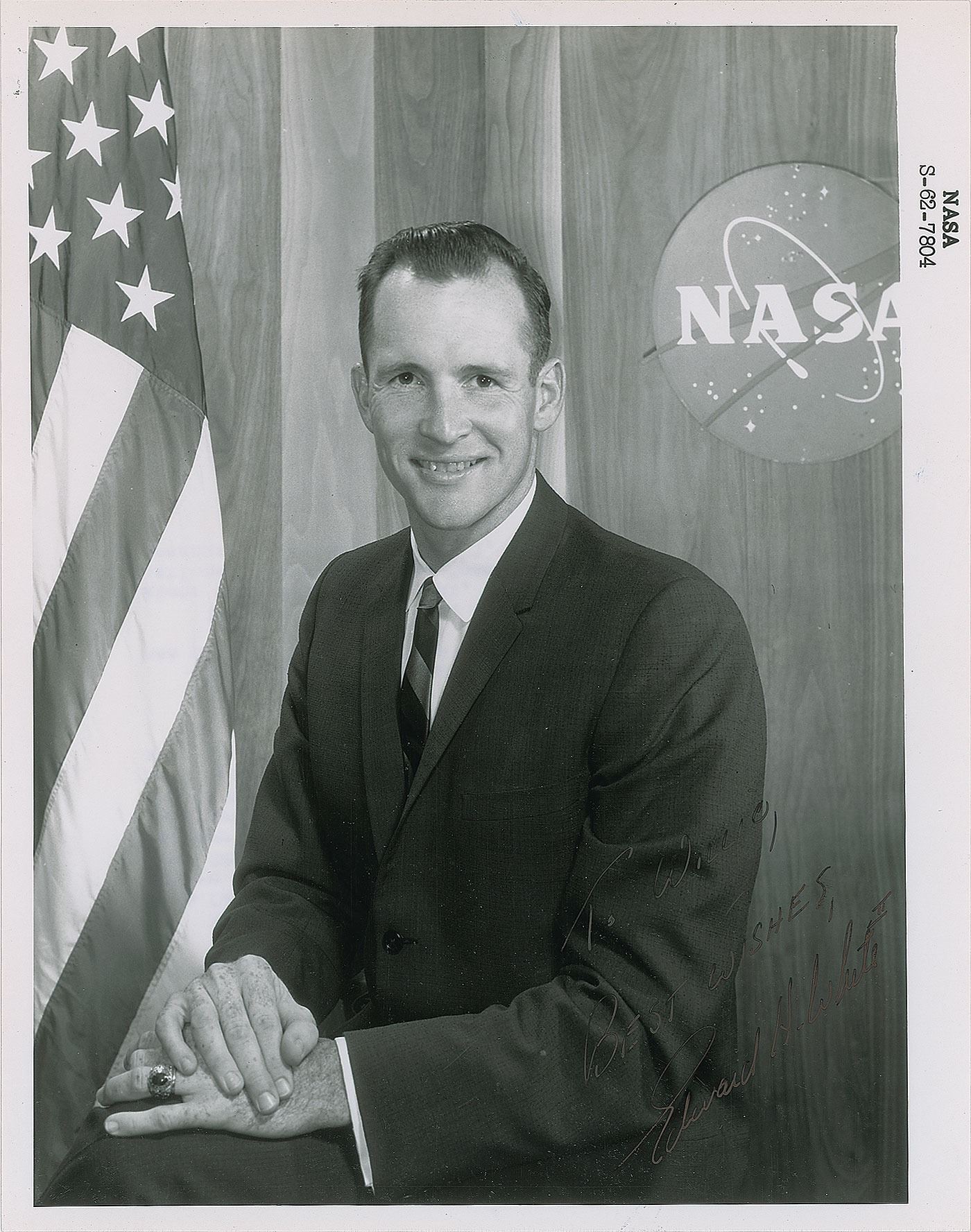 Official vintage glossy 8 x 10 black-numbered NASA photo of White in a suit and tie, signed and inscribed in black ink, "To Willie, Best wishes, Edward H. White II.” Reverse bears purple NASA caption text. In fine condition, with poor signature contrast against the dark background
