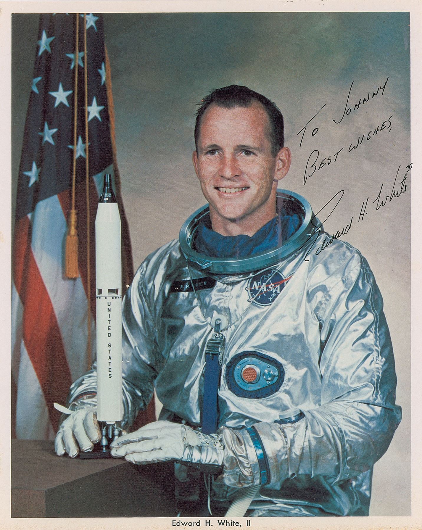 Official color 8 x 10 NASA lithograph of White posing in his Gemini suit with a model rocket, signed and inscribed in black ink, "To Johnny, Best Wishes, Edward H. White II.” In fine condition, with a few light scuffs.