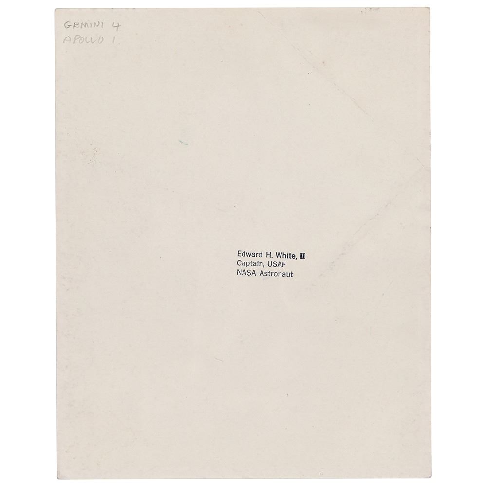 Official color 8 x 10 NASA lithograph of the Apollo 1 senior pilot in a suit and tie, signed in blue ballpoint, "Edward H. White II." In very good condition, with small stains, a surface scratch, and several heavy creases. Accompanied by a full letter of authenticity from Zarelli Space Authentication.