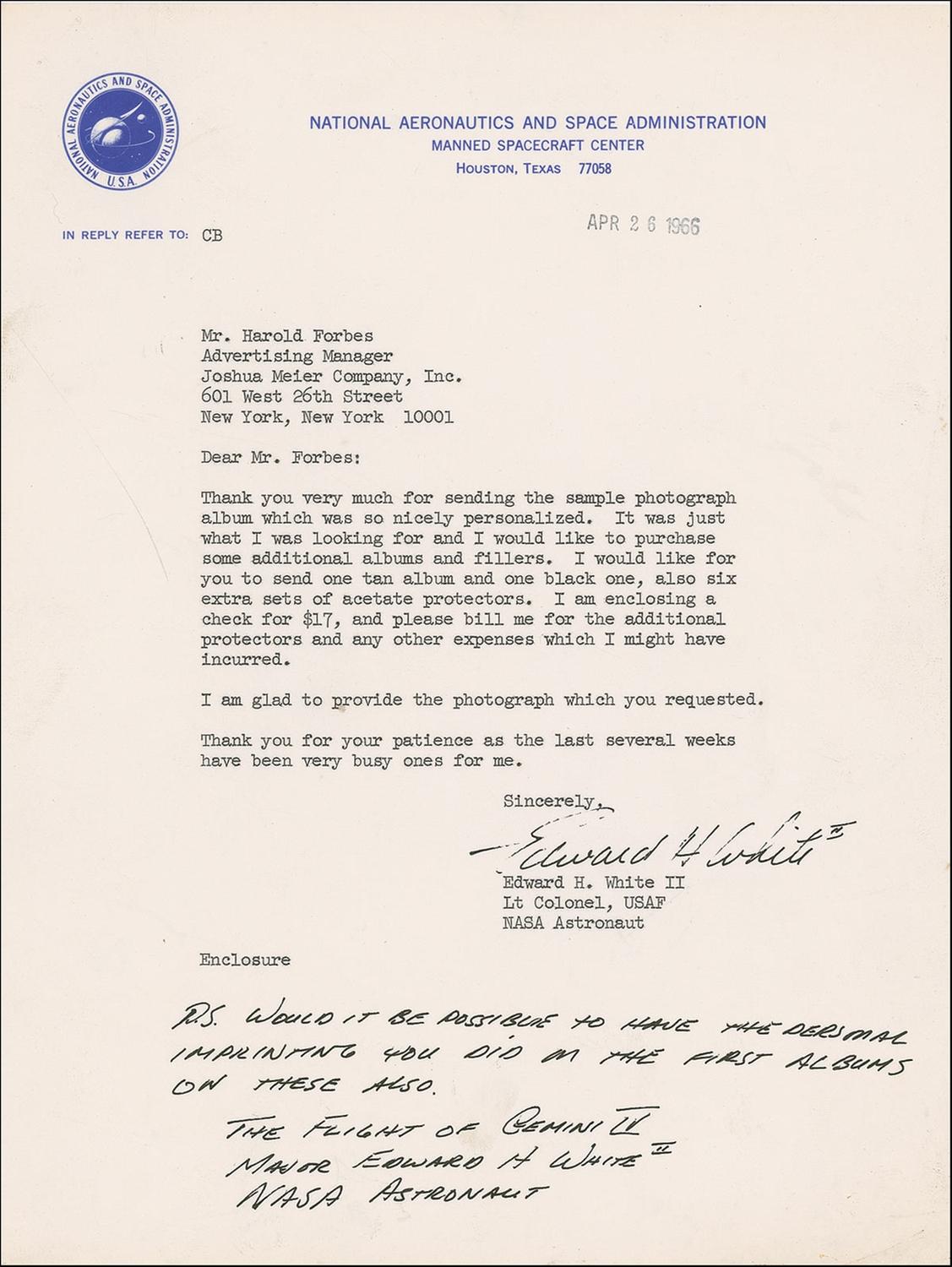 Astronaut (1930–1967) who was the first American to walk in space and who died in the flash fire that killed the entire Apollo 1 crew. TLS, one page, 8 x 10.5, NASA letterhead, April 26, 1965. White contacts a New York City advertising manager. In full: “Thank you very much for sending the sample photograph album which was so nicely personalized. It was just what I was looking for and I would like to purchase some additional albums and fillers. I would like for you to send one tan album and one black one, also six extra sets of acetate protectors. I am enclosing a check for $17, and please bill me for the additional protectors and any other expenses which I might have incurred. I am glad to provide the photograph which you requested. Thank you for your patience as the last several weeks have been very busy ones for me.” He has added a handwritten postscript: “Would it be possible to have the personal imprinting you did on the first albums on these also. The Flight of Gemini IV. Major Edward H. White II. NASA Astronaut.” In fine condition, with a few creases at the bottom right corner and staple hole at the top left. Great content as the excited astronaut seeks mementos from his rendezvous with history.