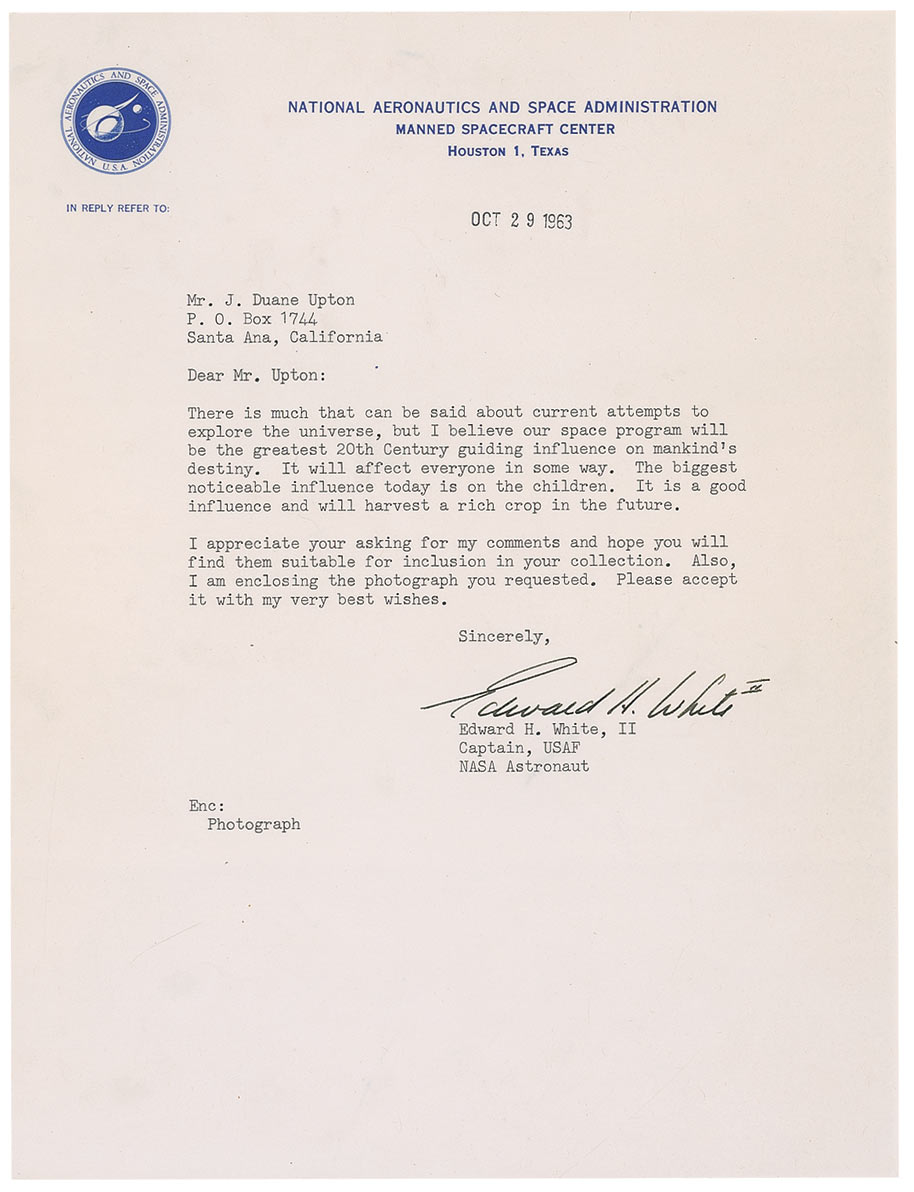TLS, one page, 8 x 10.5, National Aeronautics and Space Administration Manned Spacecraft Center letterhead, October 29, 1963. White responds to an admirer. In part: “There is much that can be said about current attempts to explore the universe, but I believe our space program will be the greatest 20th Century guiding influence on mankind’s destiny. It will affect everyone in some way. The biggest noticeable influence today is on the children. It is a good influence and will harvest a rich crop in the future. I appreciate your asking for my comments and hope you will find them suitable for inclusion in your collection.” In fine condition. Insightful comments from a tragic casualty of the space race.
