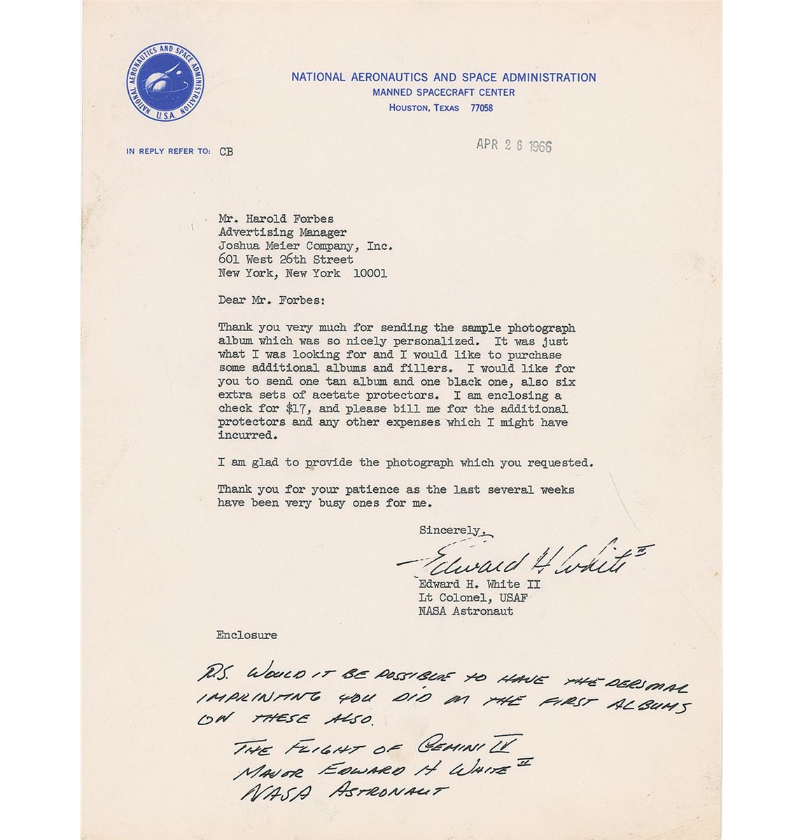 TLS, one page, 7.75 x 10, NASA letterhead, April 26, 1966. Letter to a New York advertising manager. In part: “Thank you very much for sending the sample photograph album which was so nicely personalized. It was just what I was looking for and I would like to purchase some additional albums…Thank you for your patience as the last several weeks have been very busy ones for me.” Under his signature, White adds a postscript with an additional request, “Would it be possible to have the personal imprinting you did on the first albums on these also. The Flight of Gemini IV, Major Edward H. White II, NASA Astronaut.” In fine condition, with a staple hole to top left corner.
