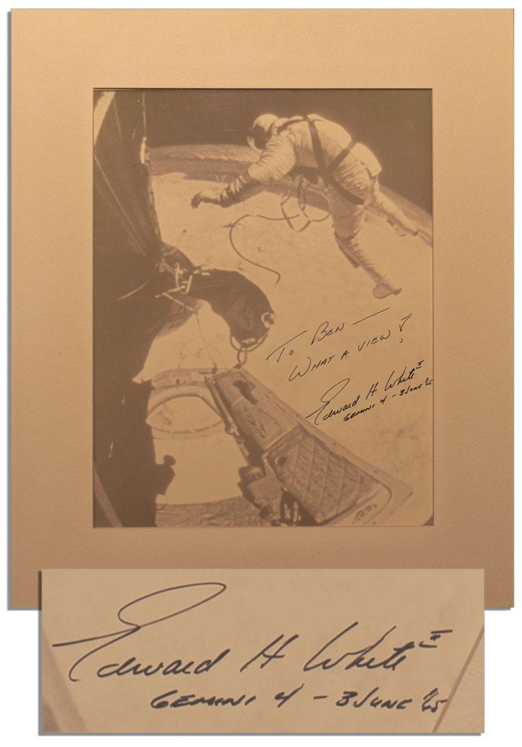 Rare and large NASA photograph of Edward H. White's historic walk in space during Gemini 4, signed by the astronaut, ''To Ben - What a View! Edward H White II / Gemini 4 - 3 June '65''. White is, of course, immortalized as the first man to ever ''space walk,'' who died less than two years later in a pre-launch test for Apollo 1. The recipient of the photo, Benjamin Cate, was the Bureau Chief Correspondent for Time magazine, who received the photo from White at a Gemini 4 press event. 11'' x 14.5'' photo is in very good condition.