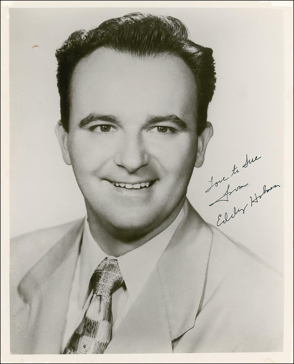 Actor best-known for his role as Tucker the galaxy rocket mechanic on Captain Video and His Video Rangers. Vintage glossy 8 x 10 photo of Holmes in a suit and tie, signed and inscribed in fountain pen “Love to Sue, From Eddy Holmes.” Scattered creasing, a spot of soiling, and some curling, otherwise fine condition.