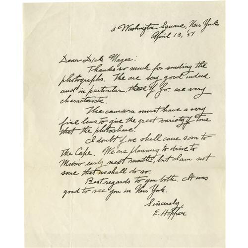 <B>Edward Hopper Autograph Letter Signed</B></I> "<I>E. Hopper</B></I>". One page, 8.5" x 10.25", plain paper, New York, April 13, 1951, to Dick Magee regarding his photography. In part, "<I>...Thanks so much for sending the photographs...The camera must have a very fine lens to give the great variety in tone that the photos have...</B></I>" Hopper was an American painter whose 1942 work, <I>Nighthawks,</B></I> is familiar to most, showing lonely customers at an all-night downtown diner, isolated from each other and the world, lost in their thoughts. This letter is boldly written and very legible, condition is fine with mailing folds and one tiny light brown stain that does not detract.