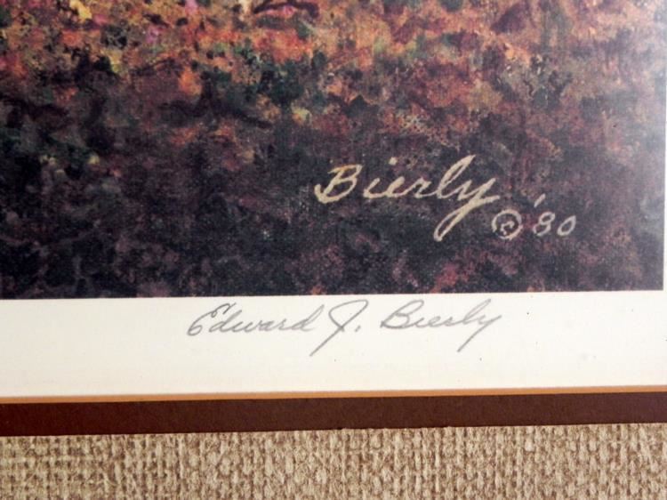 Available is this Signed, Framed, Limited Edition Print by Edward J Bierly.---Artist: Edward J Bierly--Title: Unknown--Signature: LR--Medium: Print on Paper--Edition: 36/950--Image size: 20" x 17"Frame size:26" x 23"Framing: Gold/brown paint on red wood frame with tan mattingCondition: The print is excellent, but the gold/brown on the frame is starting to peel