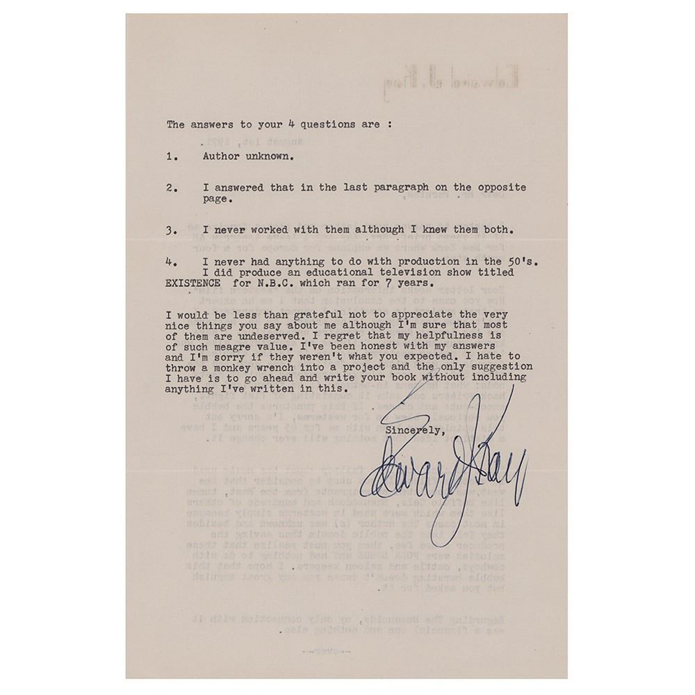 American film composer and musical director (1898–1973) nominated for five Oscars throughout the 1940s, though he never won. TLS, one page, 7.25 x 10.5, personal letterhead, August 1, 1971. Letter to "Mr. Perkins," in part: "Your letter seeks information on the 'western film.' How you came to the conclusion that I am an expert on that subject is something I cannot understand. I don't know that anyone is an expert. To me, westerns are the lowest form of creative undertaking. I have known many producers, failures at everything else, who took up making westerns because it is the simplest formula to work with. Two factions, one good and the other bad; the good always perseveres against heavy odds; what happens in-between is as formulized as hack writers can make it consisting of fist fights, shoot-outs and chases. If this punctures the bubble you obviously blew up for westerns, I'm sorry but this opinion has been with me for 45 years and I have a distinct idea that nothing will ever change it.