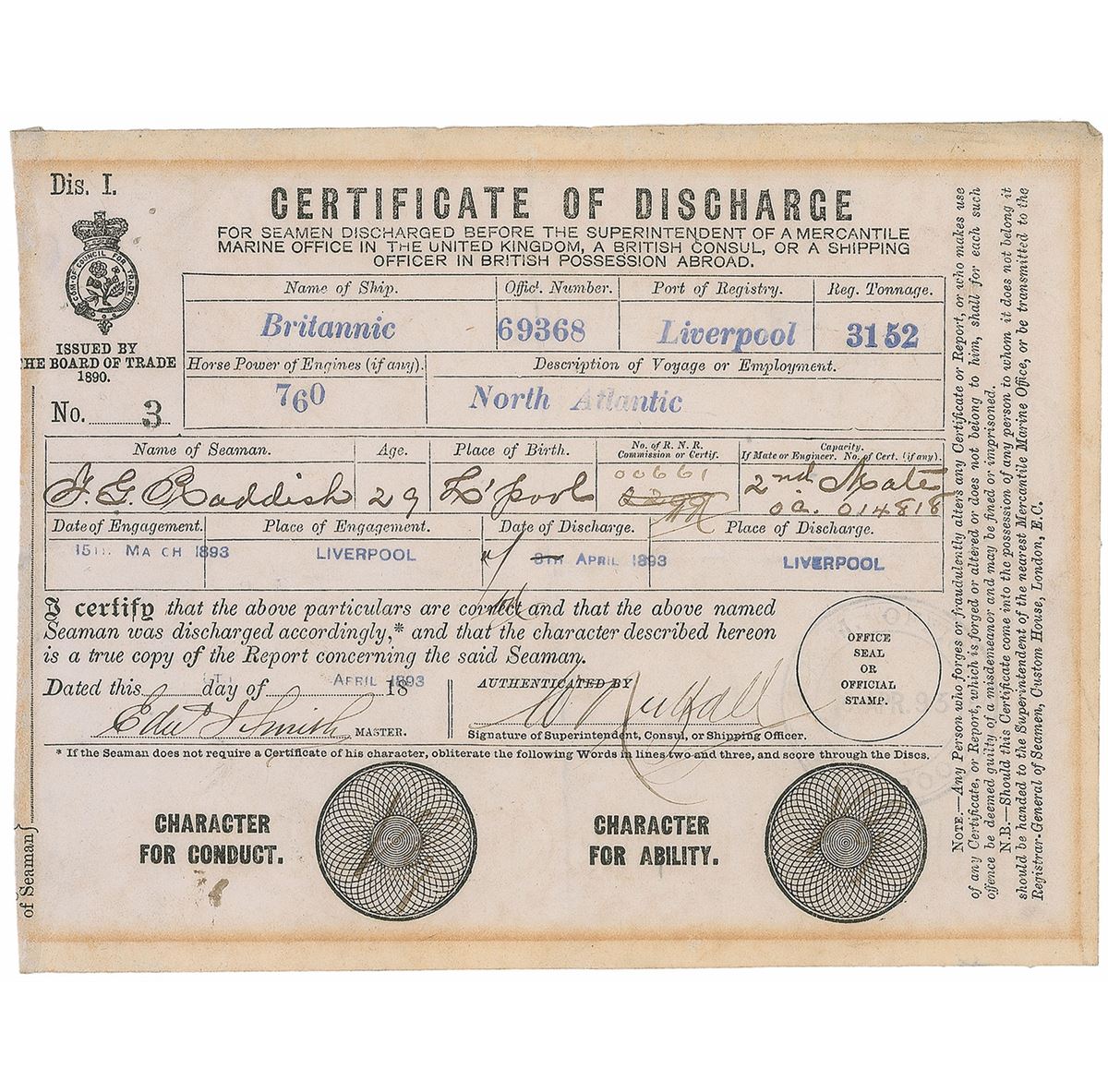 Partly-printed DS, signed “Edw’d J. Smith,” one page, 7.5 x 6, April 8, 1893. A certificate of discharge issued to T. G. Raddish, a second mate on board the Britannic. The document states Raddish served aboard the vessel from March 15, 1893, until April 1893, and was discharged in Liverpool. Printed near the bottom is a certification statement which reads, “I certify that the above particulars are correct and that the above named Seaman was discharged accordingly, and that the character described hereon is a true copy of the Report concerning the said Seaman.” Signed at the conclusion of the statement by Smith as the vessel’s master, and countersigned by a shipping representative. The discharge also bears two “V.G.” notations in areas for character of conduct and ability. In fine condition, with toning to edges. Smith joined the White Star Line in 1880 and assumed command of the Britannic, a post he held until May of 1893, when he left to briefly command the Adriatic. As he rose in seniority, Smith became a favorite of the wealthy financiers and notables who frequently traveled aboard his ships, acquiring the nickname the ‘Millionaires' Captain.’ From 1904 on, Smith commanded the White Star Line’s newest vessels on their maiden voyages, including the R.M.S. Titanic. An exceedingly rare autograph in any form particularly this early in his career.