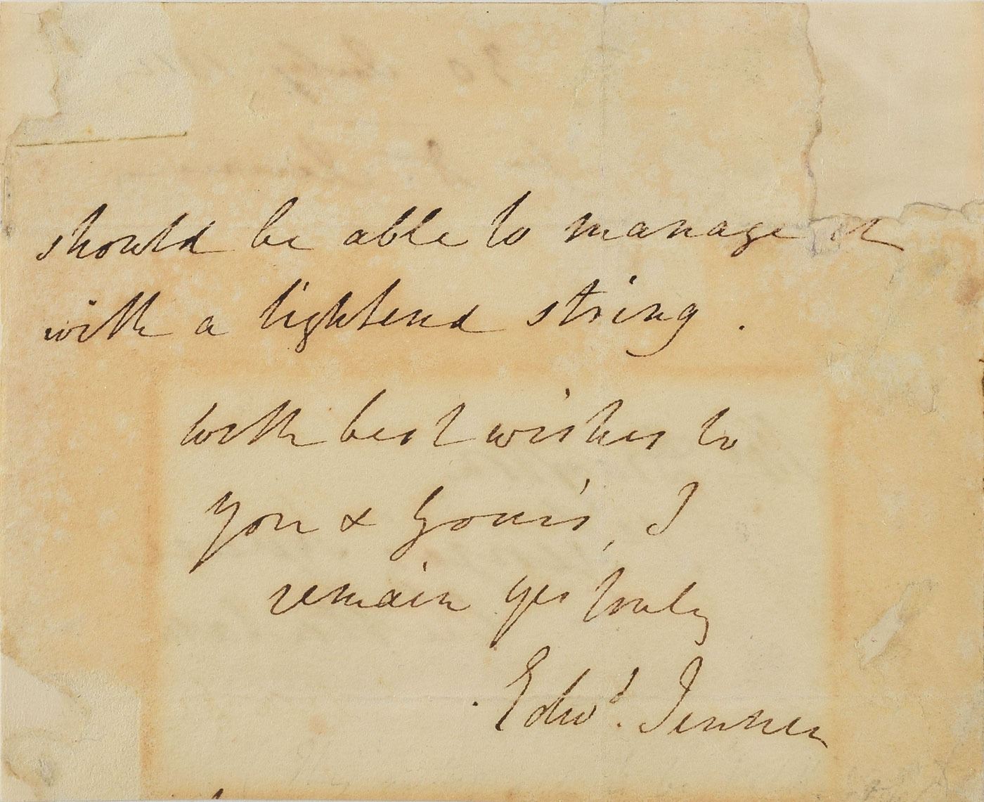 English physician and scientist (1749–1823) often called the ‘father of immunology,’ who successfully tested his smallpox inoculation in 1796. Partial ALS, one page, 4.5 x 3.75, [July 30, 1812 annotated on the reverse in another hand]. The conclusion of a letter to "Mr. Drayton, St. George's Square, Cheltenham," in full: "should be able to manage it with a tightened string. With best wishes to you & yours, I remain yrs truly, Edw'd Jenner." Addressed on the reverse in Jenner's hand. In very good condition, with areas of repaired paper loss, and a block of toning from prior display.