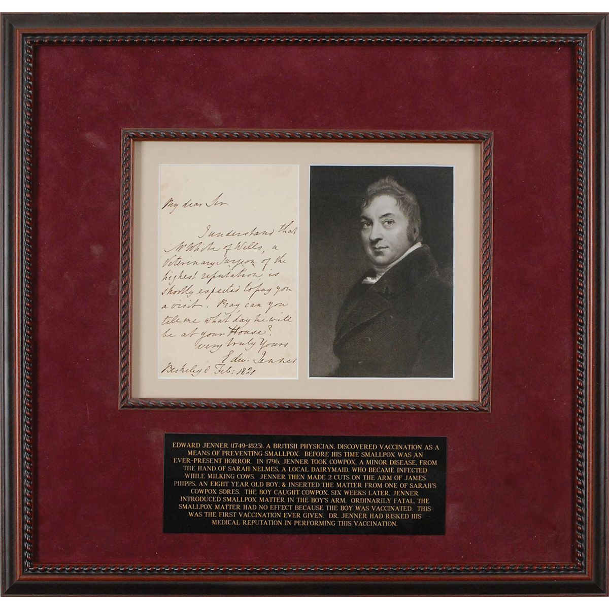 English physician and scientist (1749–1823) often called the ‘father of immunology,’ who successfully tested his smallpox inoculation in 1796. Rare ALS signed “Edw. Jenner,” one page, 4 x 6.5, February 1821. Letter to a gentleman. In full: “I understand that Mr. White of Wells, a veterinary surgeon of the highest reputation is shortly expected to pay you a visit. Pray, can you tell me what day he will be at your house?” Attractively double–suede-matted with an engraved portrait and biographical plaque, and framed to an overall size of 18.5 x 18. In fine condition.