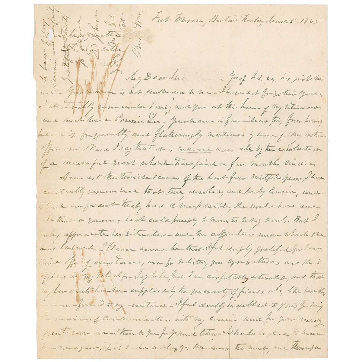 Confederate general (1816–1873) who opted against attacking Culp’s Hill at the Battle of Gettysburg, a decision frequently blamed for the loss of this decisive battle. Civil War–dated ALS signed in the upper left, “Ed. Johnson, Maj Genl, CSA, Pris. War,” one page, 8 x 9.75, March 5, 1865. Letter written while held captive at Fort Warren as a prisoner of war. In part: “Your name is not unknown to me. I have not forgotten you. I distinctly remember having met you at the house of my esteemed and much loved cousin Lee. Your name is familiar, too, from having heard it frequently and flatteringly mentioned by some of my brother officers. Need I say that it is endeared to us all by the recollection of a mournful event which transpired a few months since. Amidst the terrible scenes of the last four years I have constantly remembered that true devoted and lovely cousin, and I feel confident that, had it been possible, she would have done all that a generous heart could prompt to minister to my wants.” In very good condition, with intersecting folds with small edge separations, a spot of paper loss to upper left corner, and stray ink marks to the left side.