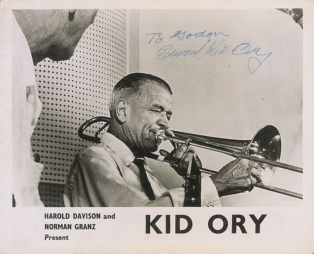 Jazz trombonist and big band leader (1886-1973). Vintage glossy 10 x 8 publicity photo, signed and inscribed in blue ink “To Gordon, Edward ‘Kid’ Ory.” Scattered light creases and surface marks, otherwise fine condition. Accompanied by a certificate of authenticity from Tracks.
