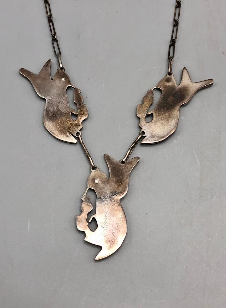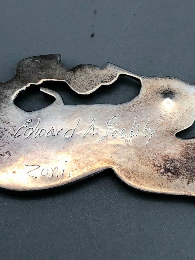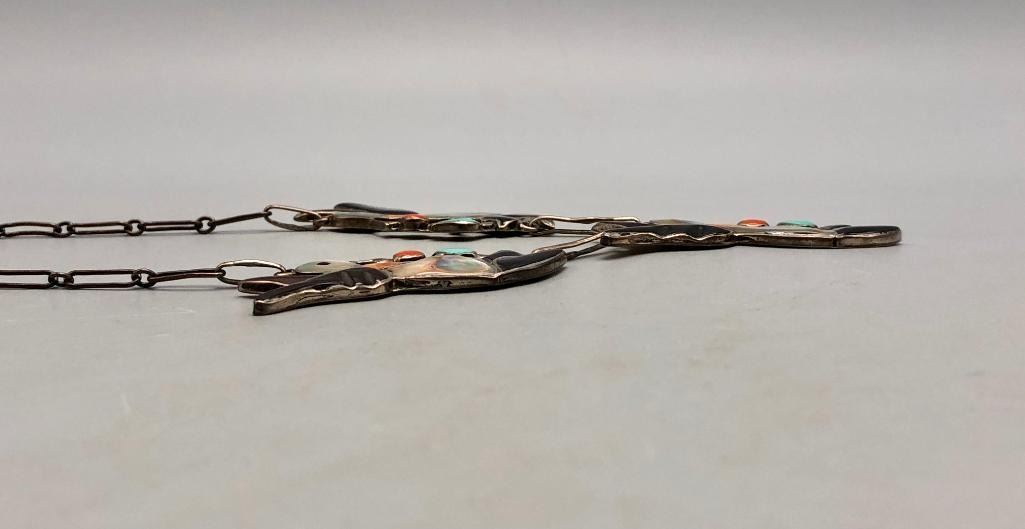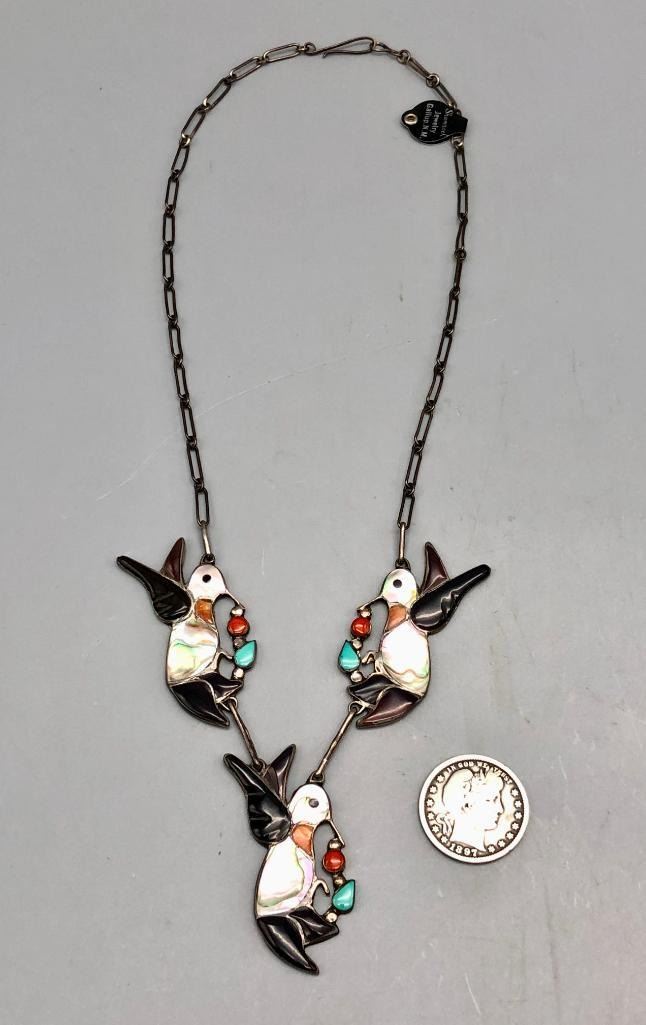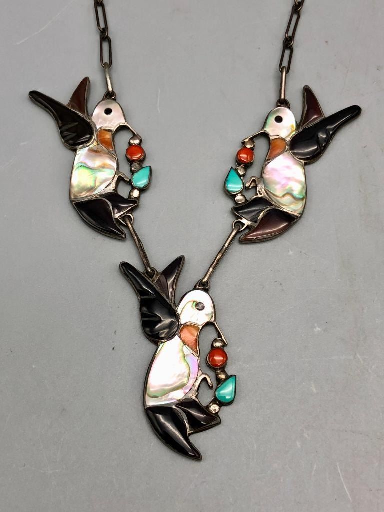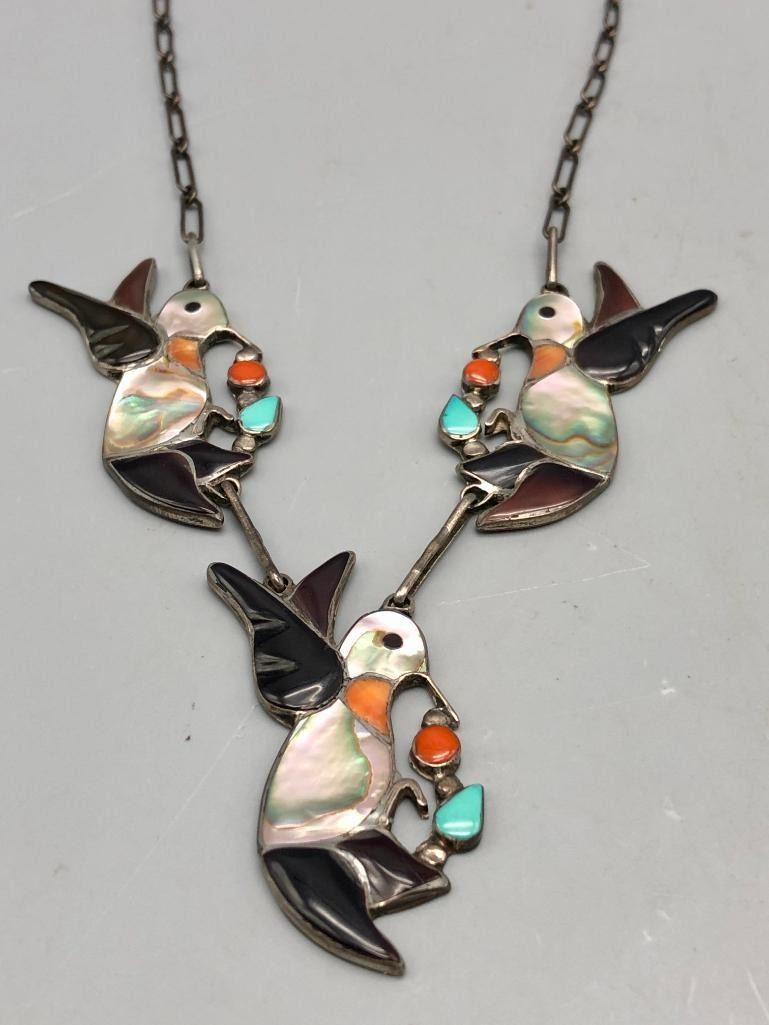 Offered for sale in this lot is a Zuni hummingbird inlay necklace. This great necklace has three hummingbirds that are inlaid with shell, coral, turquoise and onyx. It does have some carved details in the stones, giving the piece some dimension. It is on a handmade chain and is made from sterling silver. MAKER: Hallmarked Edward A. Leekity, Zuni in etched scripted. APPROX AGE: Circa 1970s. SIZE: Fits a 19 inch neck. Pendant measures 2 inches long X 7/8 inches wide. Weighs 25.1 grams. CONDITION: Good for its age, normal wear expected. Please look closely at the pictures as they are an important part of our description and are hereby incorporated into the description, specifically with regards to condition. SHIPPING: There will be a $5 handling / packaging fee for shipping this lot. The actual cost of postage will be added on top of that. BUY IT NOW: If you would like to buy this item now, without waiting for the auction day to bid on it, we do offer this option (which is available up to 48 hours before the actual auction starts). The “Buy it Now†price is the high estimate of this lot (plus applicable fees and the Buyer's premium is discounted to 10% when using the Buy it Now option). If you would like to exercise this option, you must contact us by email (or phone as long as you talk to someone live). Reference this lot number and your intention to "Buy it Now."