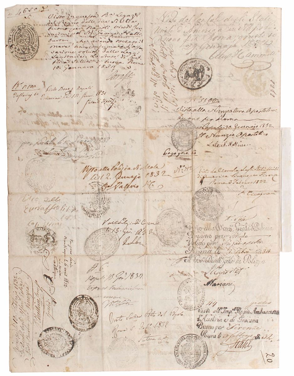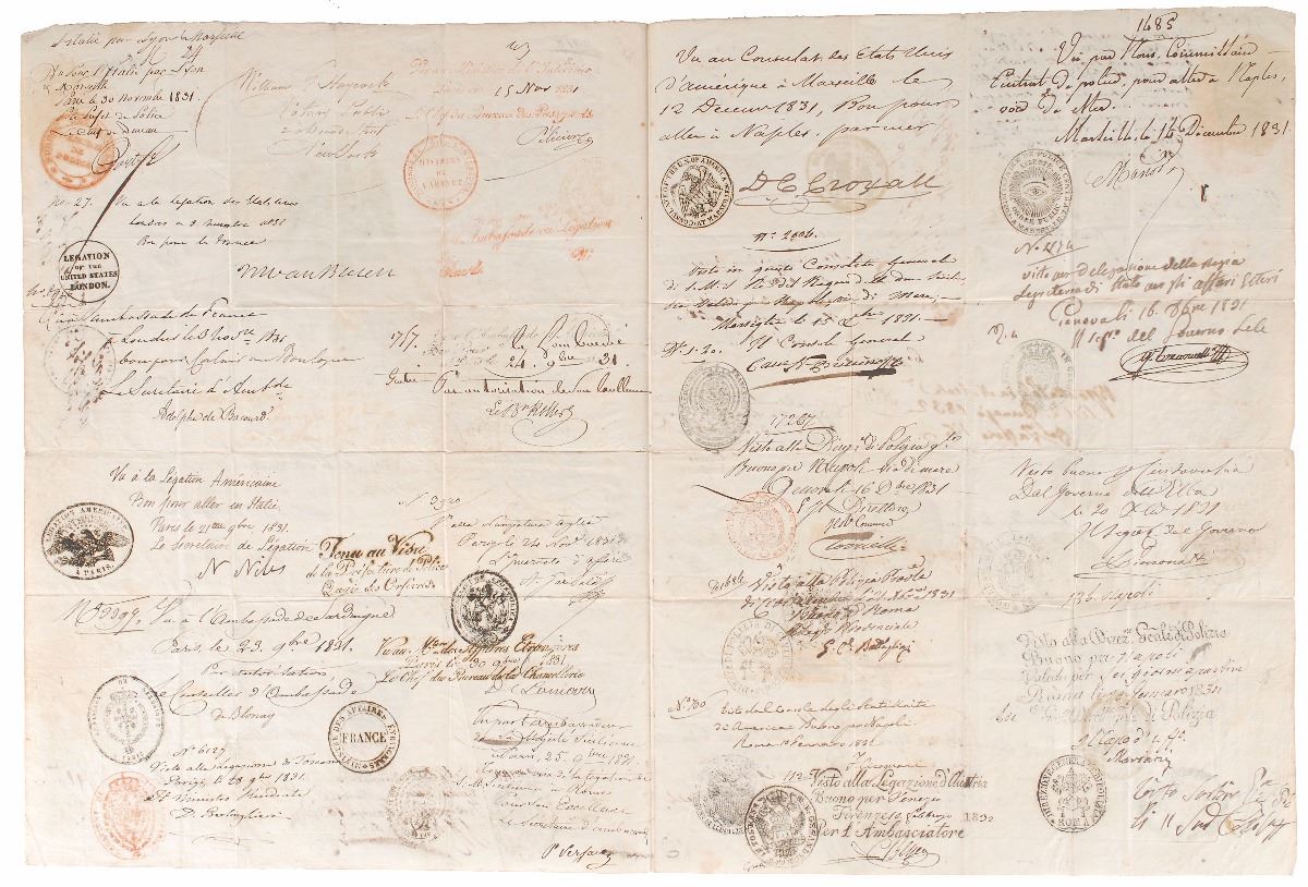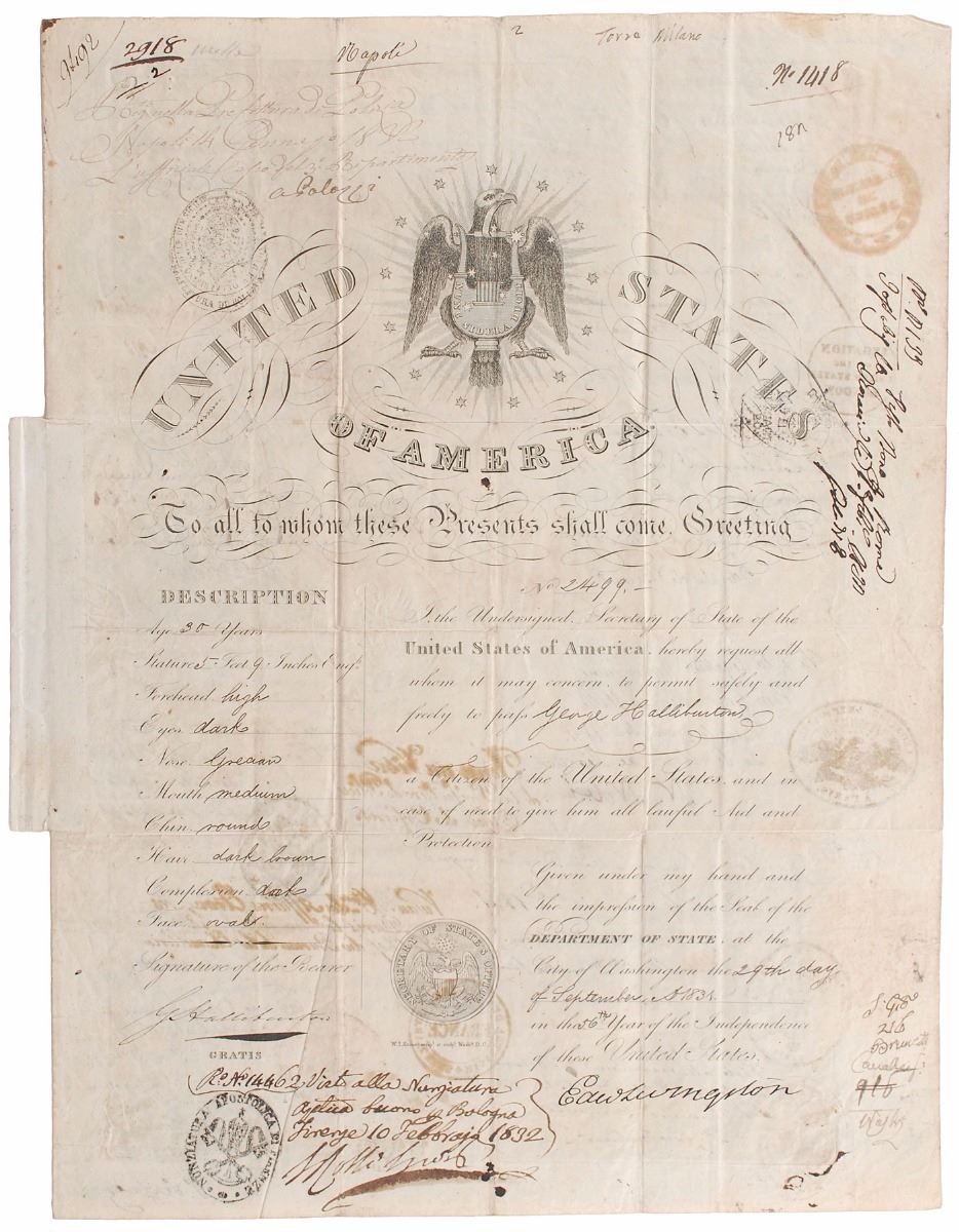 American statesman (1764–1836) who helped draft the Louisiana Civil Code and served as Andrew Jackson’s secretary of state. Partly-printed DS, signed “Edw. Livingston,” one page, 11.5 x 15.5, September 29, 1831. Official passport issued to George Halliburton, providing instructions to “permit safely and freely to pass, George Halliburton, a Citizen of the United States.” Filled out along the left side with his physical description. Signed at the conclusion by Livingston as secretary of state. In very good condition, with show-through from stamps and endorsements to reverse, and a mounting strip to left edge.