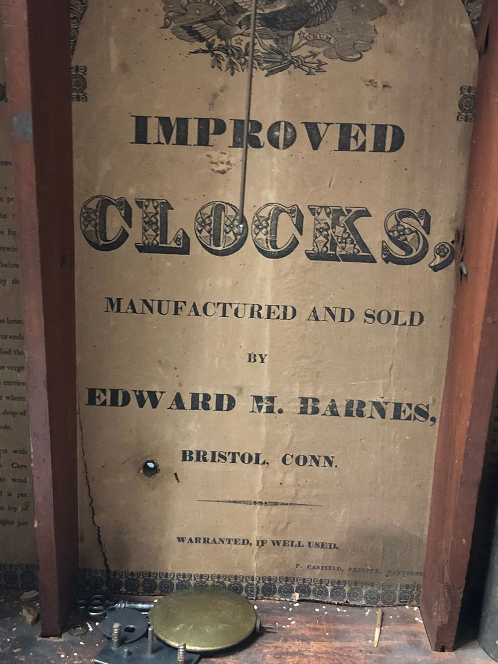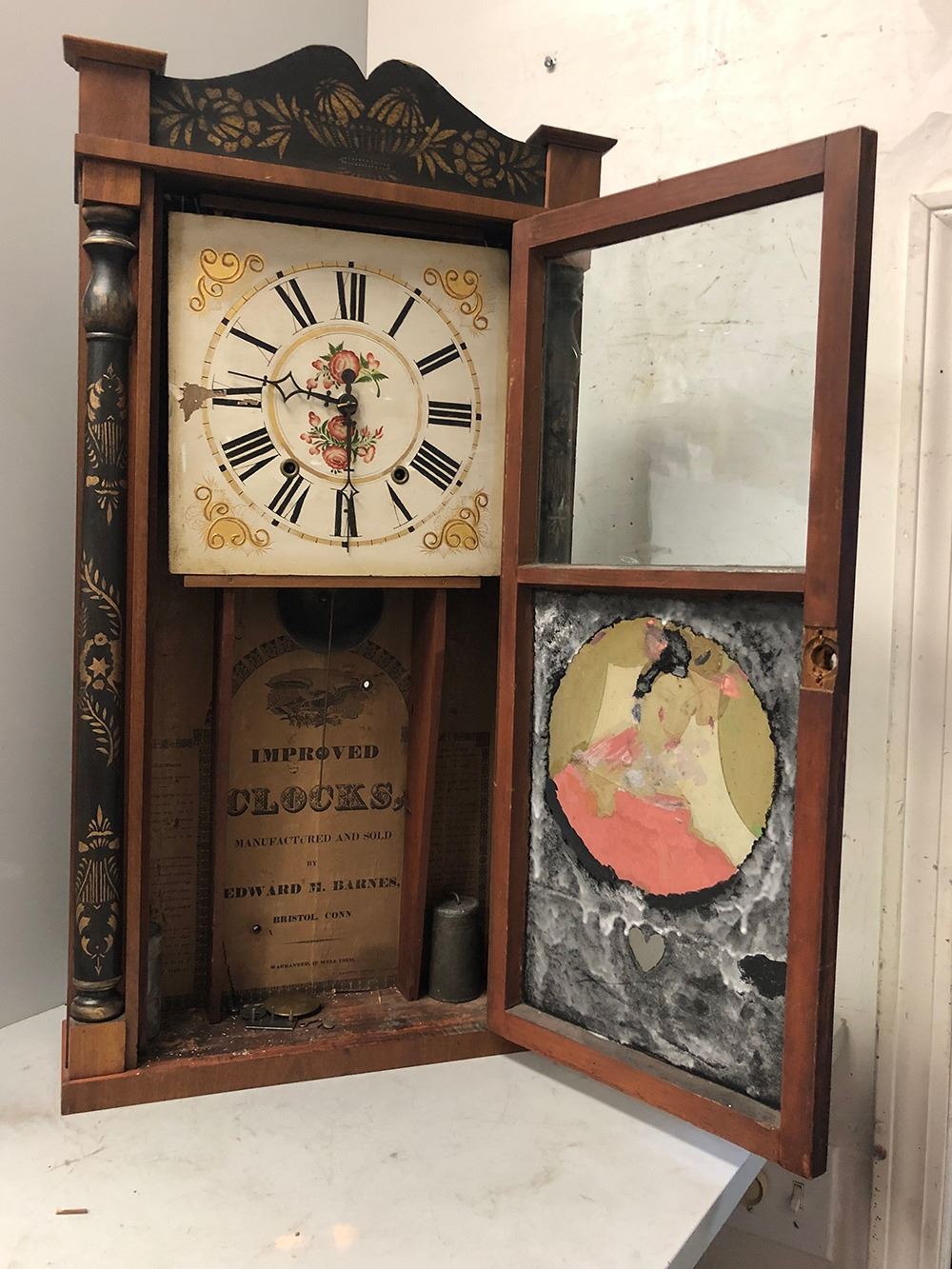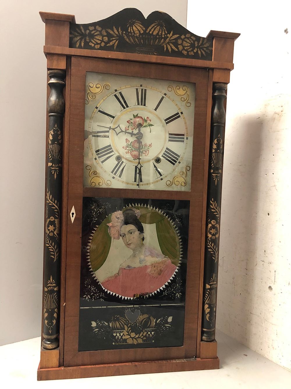 Unusual Edward M. Barnes, Bristol, CT wooden works clock. Stencilled front with possibly a Barnes family member portrait on glass, a very unusual clock in beautiful condition. Was in running condition at the estate. From the Chatham, Ma, Cape Cod Collection.