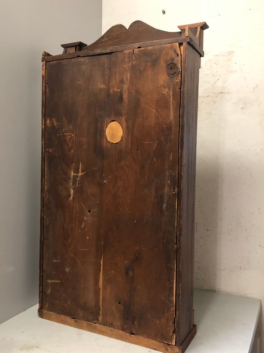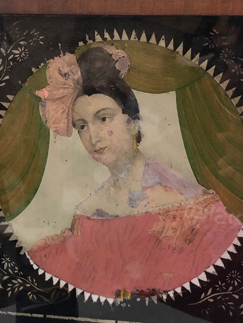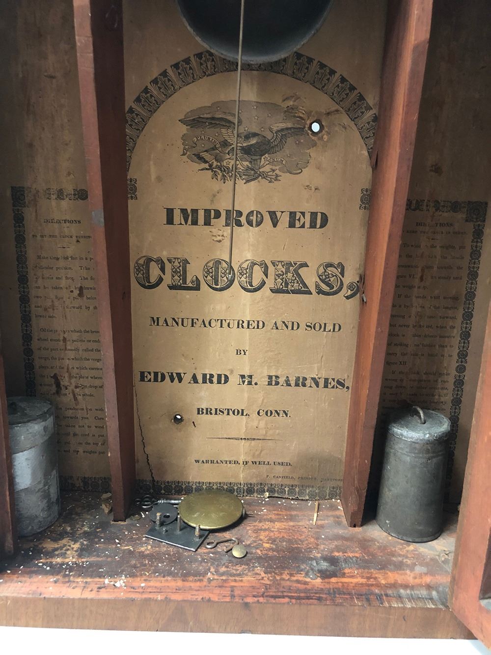 Unusual Edward M. Barnes, Bristol, CT wooden works clock. Stencilled front with possibly a Barnes family member portrait on glass, a very unusual clock in beautiful condition. Was in running condition at the estate. From the Chatham, Ma, Cape Cod Collection.