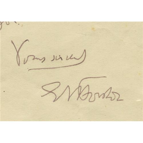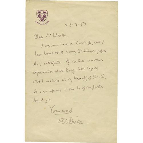 <B>Edward M. Forster Autograph Letter Signed</B></I> “<I>E M Forster</B></I>”. One page, 4.5” x 7”, July 26, 1950, King's College, Cambridge, Massachusetts. Written on King's College stationery, the letter reads in full: "<I>Dear M: Winster, I am now back in Cambridge and I have looked at H. Loves Dickinson papers. As I anticipated, they contain no more information about Henry Salt...which I included in my biography of S.L.D. So I am afraid I can be of no further help. Yours sincerely</B></I>" The letter is attached to a board with a photo of the author. It could quite possibly be removed. <BR><BR><b>Shipping:</b> Books & Catalogs (<a target="_blank" href="http://www.heritageauctions.com/common/shipping.php">view shipping information</a>)